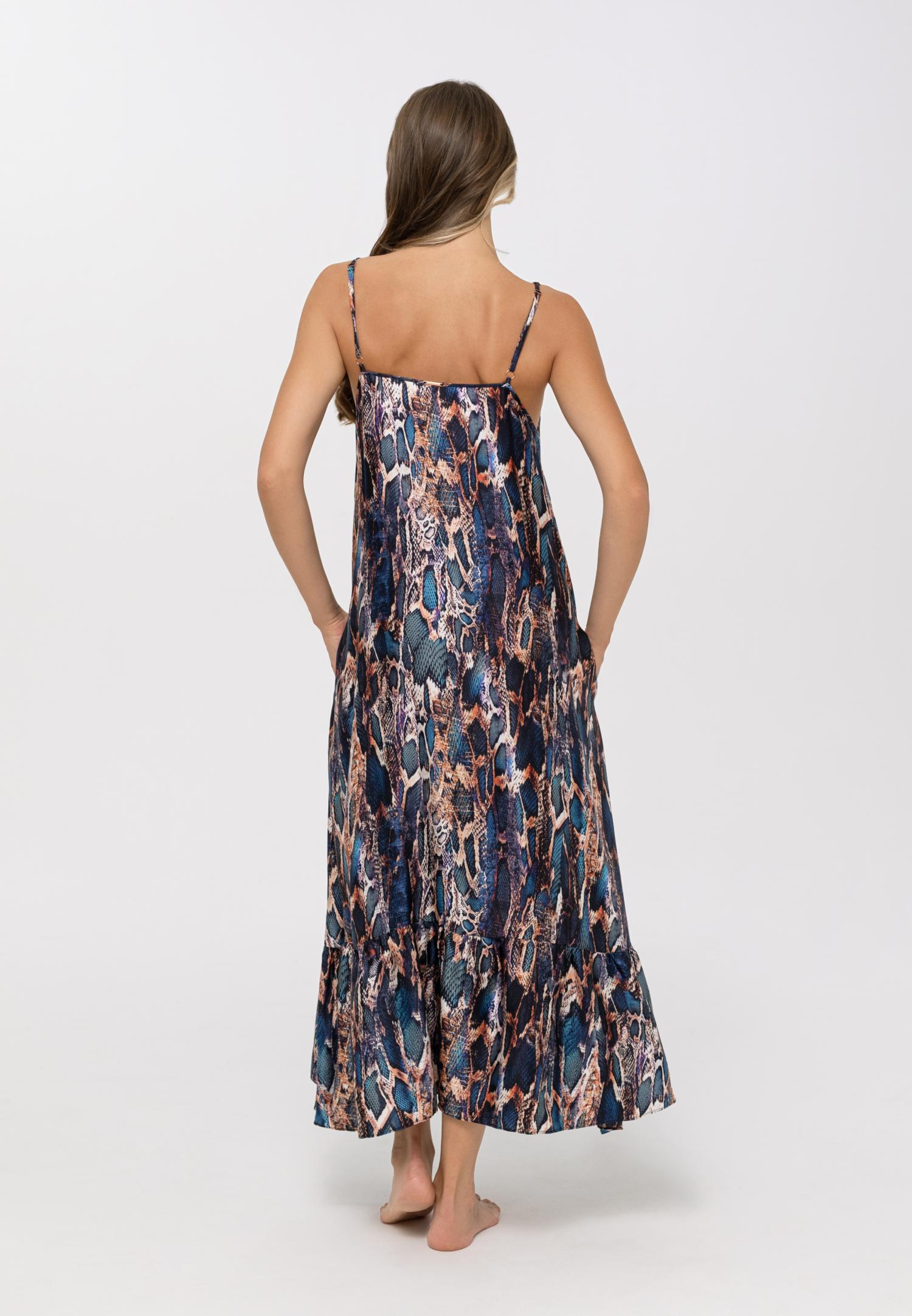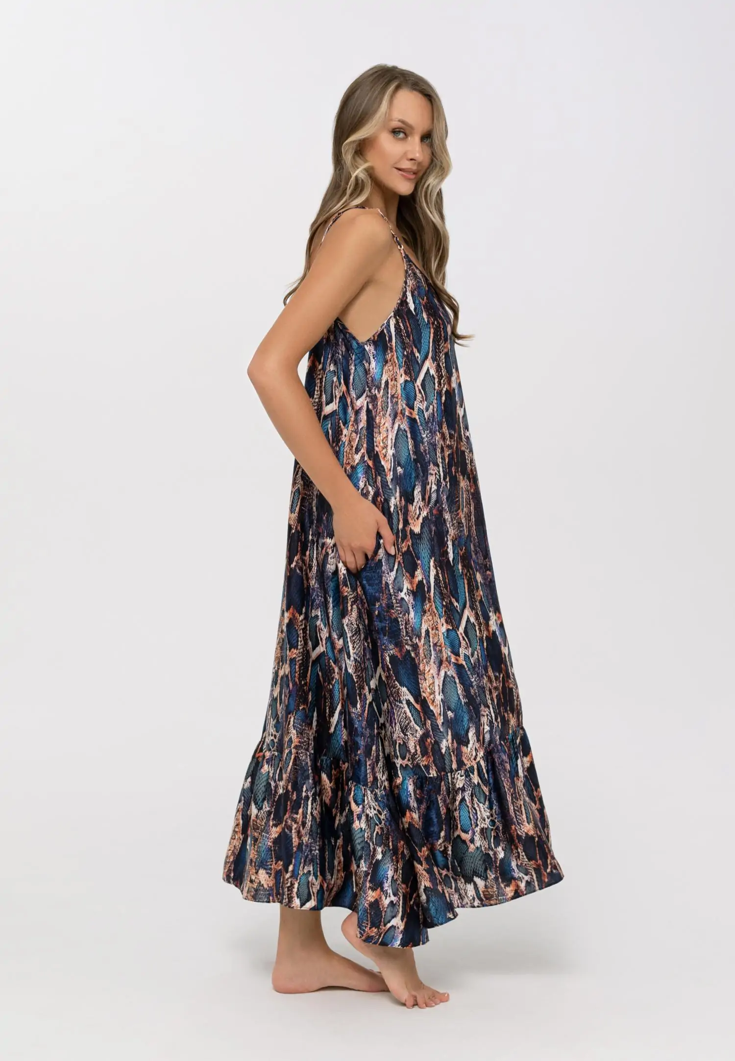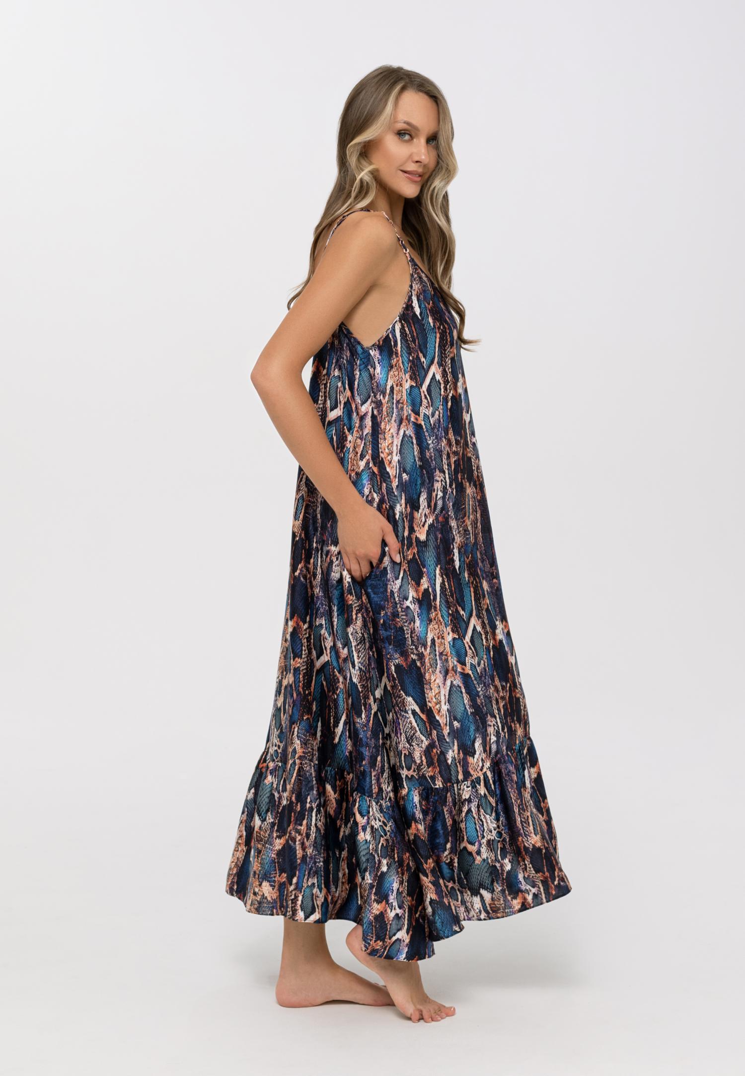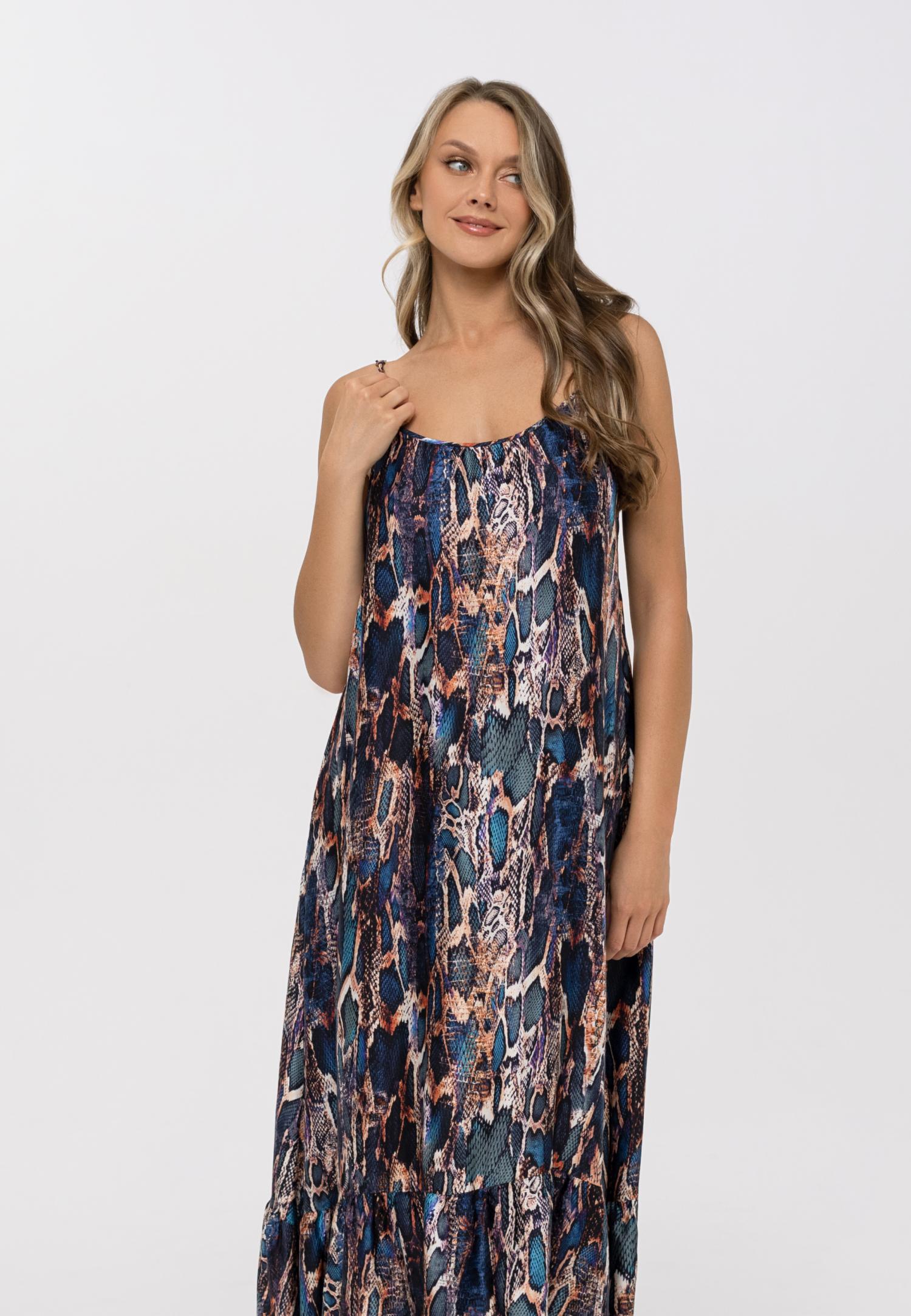 Printed maxi dress, with side pockets. Loose fit, lengthadjustable shoulder straps with decorative trims.