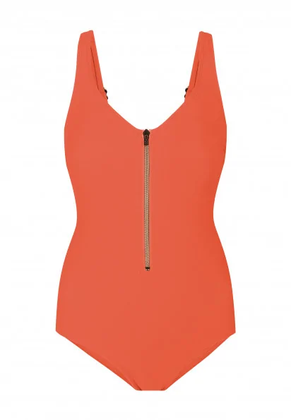 Light sewn-in padding and supportive elastic underbust band. Golden effect silicon zipper. Regular legline with regular bottom coverage. Wider shoulderstraps and scooped back.