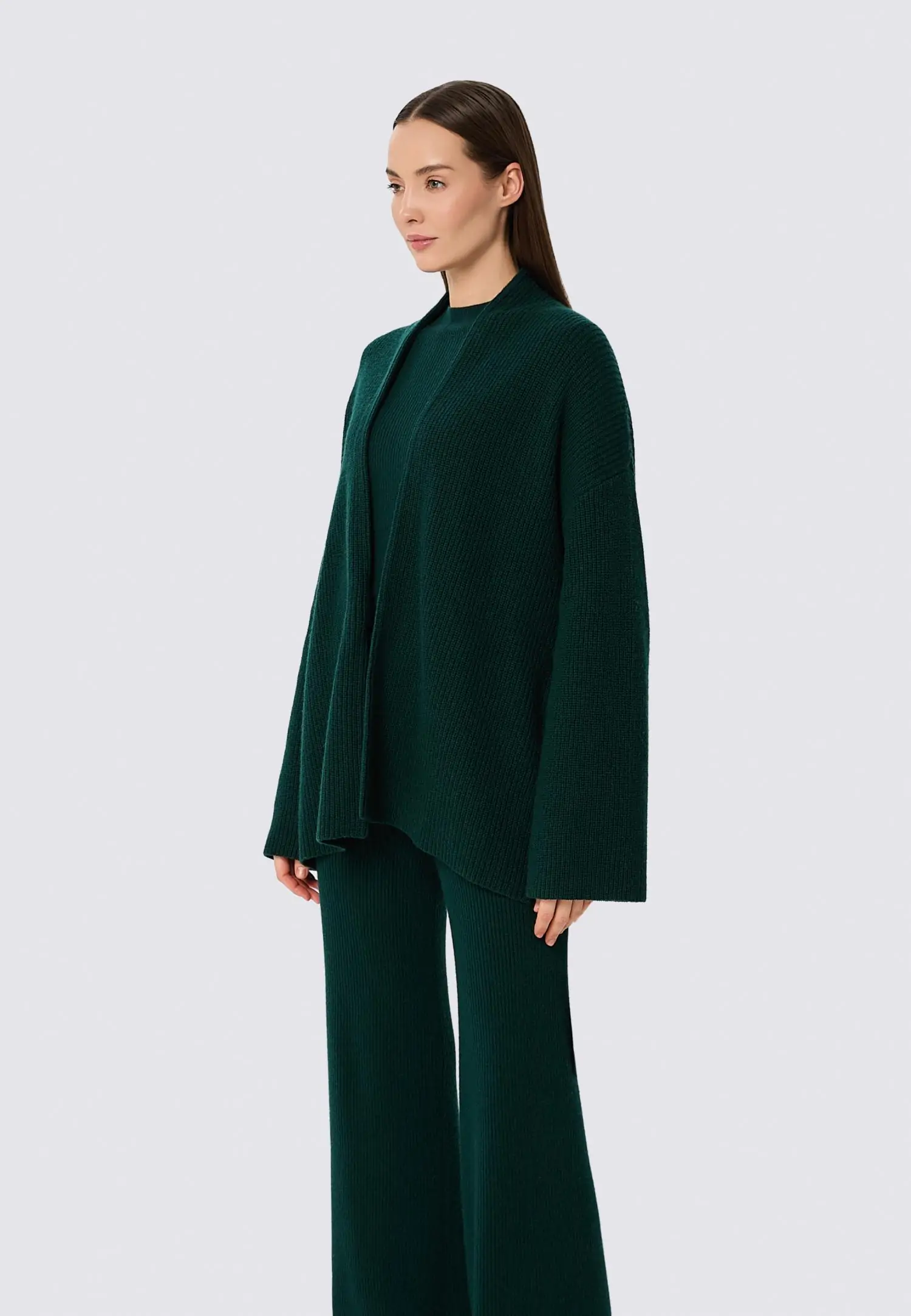 This cashmere cardigan combines seemingly contrasting qualities: homey comfort and the refined aesthetics of Eastern silhouettes. The piece resembles a cropped kimono with its straight cut, wide sleeves, gentle shoulder line, and removable belt. The soft double-layered ribbed knit offers an endless feeling of warmth and comfort. The elegant pearl-beige tone evokes forest nature and inner harmony. A harmony of everyday comfort and delicate femininity in the QUITE MOTION collection.