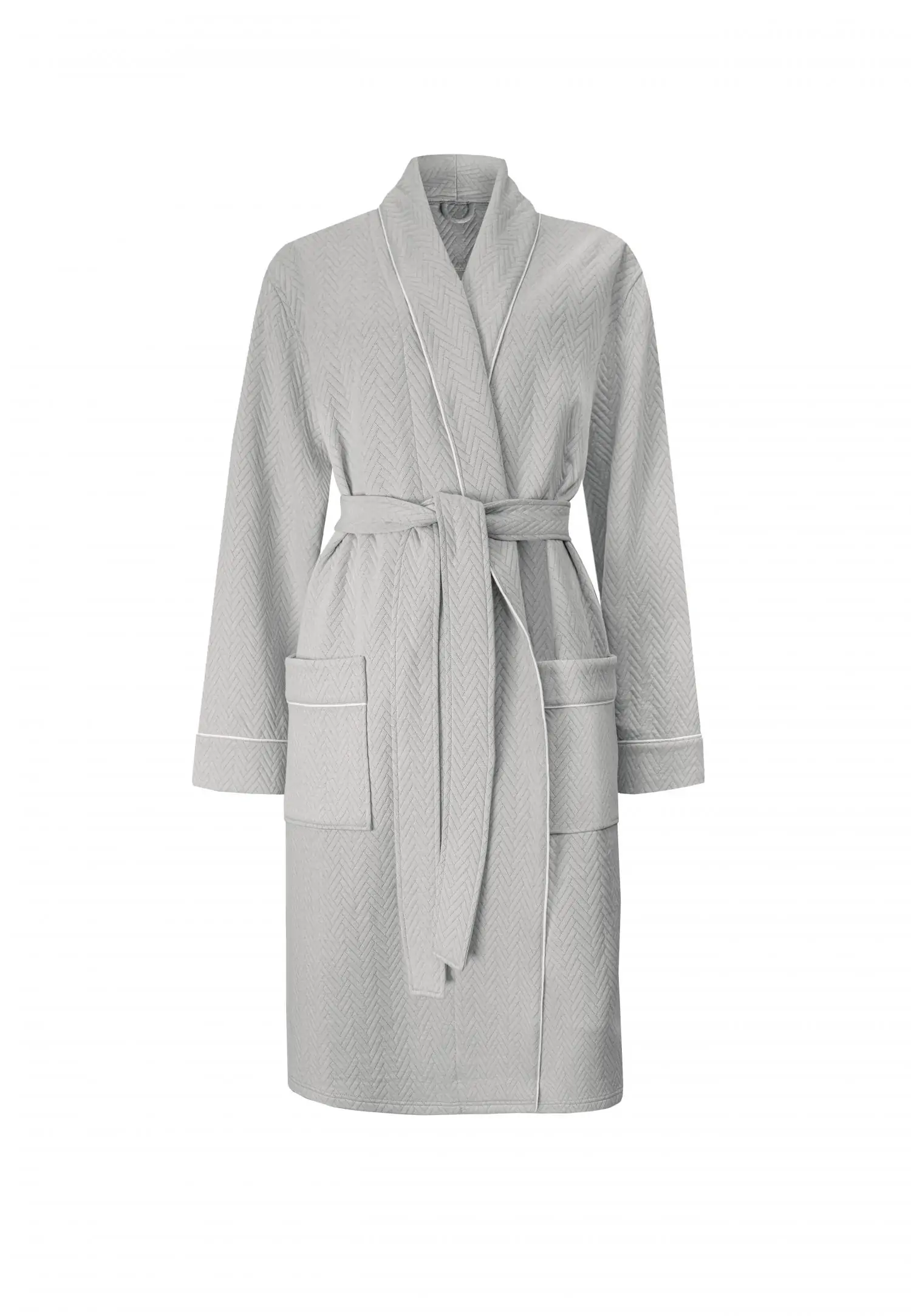 Extremely comfortable women's morning gown, designed with a shawl collar, rolled cuffs a self-belt and practical pockets. Crafted from soft herringbone cotton jersey knit and padded with plush polyfill, it features an innovative air layer for superior insulation without bulk, ensuring a light and cozy experience.