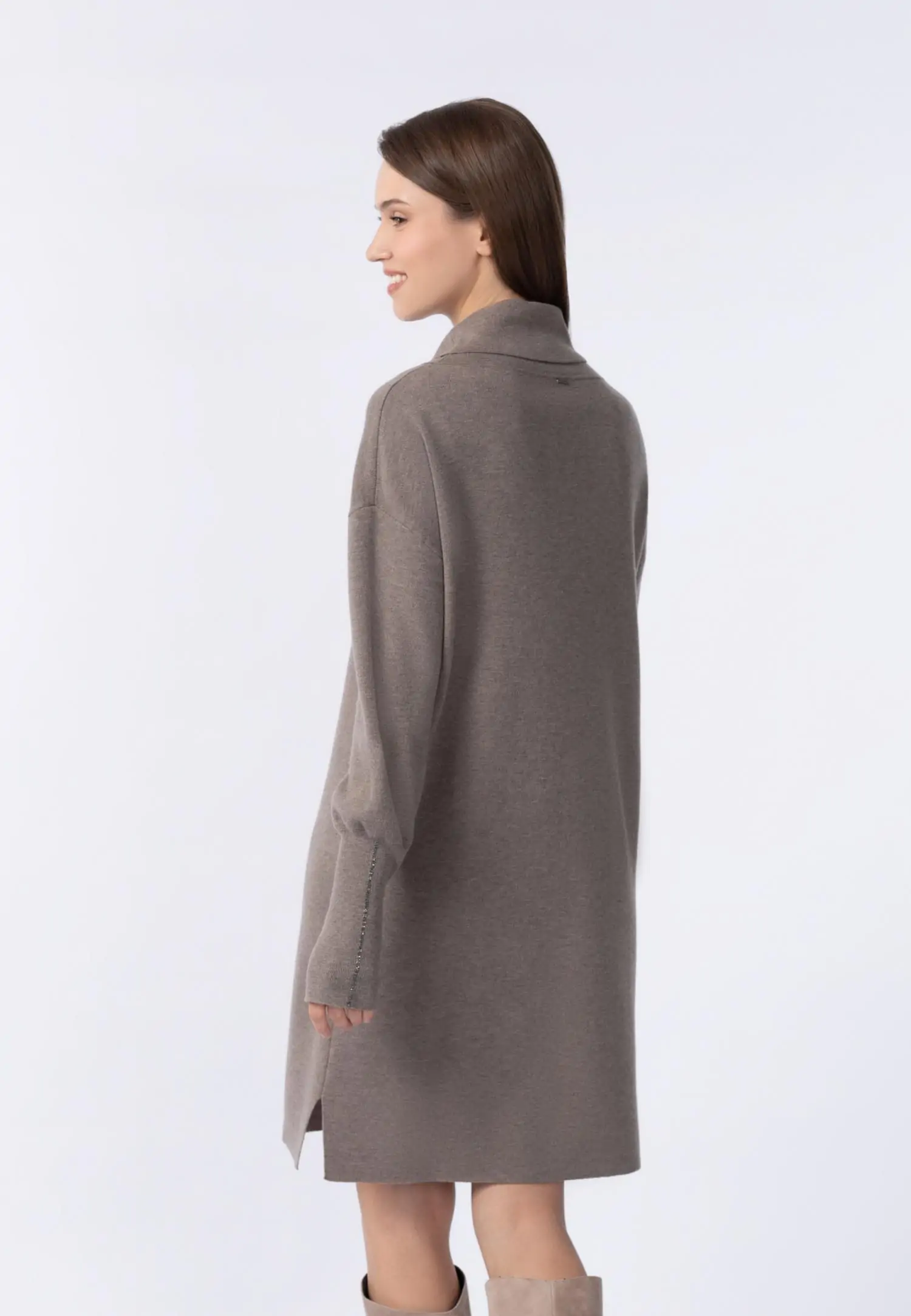Elegantsete puhvvarrukatega sirgelõikeline veidi põlvedest ülespoole ulatuv tuunika on kootud luksuslikust kašmiiri- ja meriinovillasegu lõngast, mis annab tootele siidise pehmuse ja erakordse soojuse. Avar ning kaunilt langev kõrge krae lisab sviitrile elegantsi. Pikendatud õlajoon lisab sviitile avarust ja mugavust. Soonikkoes varrukasuul olev peen tumehall metallik-tooni kettdetail rõhutab džempri luksuslikkust ja erilisust. Mansettidel olev pöidlaava lisab mängulisust. Tuunika on kootud interlok-koes, mille puhul kudumi mõlemad pooled on ühesuguse sileda ja tiheda pinnaga. See kude hoiab hästi vormi, imab paremini niiskust, säilitab soojust ning venib vähem. Kombineeri koos samasse seeriasse kuuluvate kõrge vöökohaga pükstega või kanna kleidina. Toode on uhkusega disainitud Eestis!