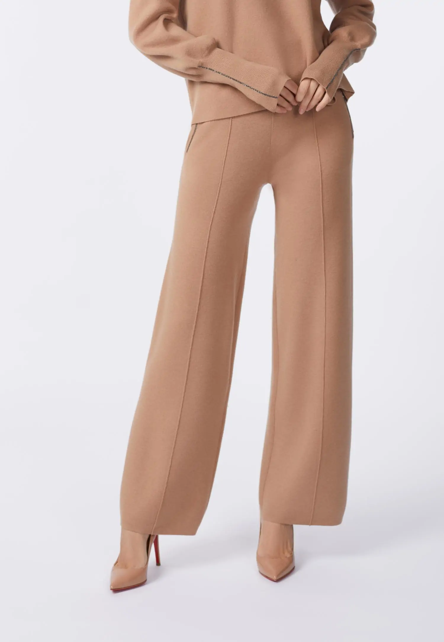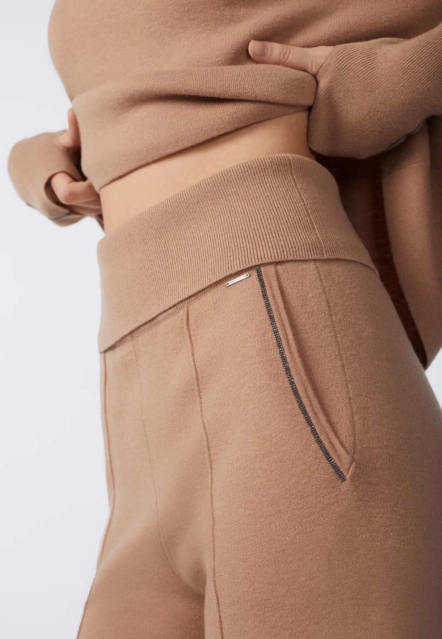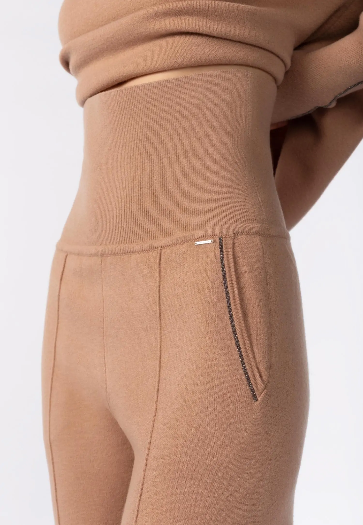 Kõrge vöökohaga elegantsed pikad püksid, mille esiosal olevad salendavad disainõmblused toovad esile naiseliku figuuri ja lisavad enesekindlust. Soonikkoes allakeeratav värvel pakub erinevaid kandmisvõimalusi, sobides nii rasedatele kui ka neile, kes eelistavad lühikese topi kandmist ilma kõhtu paljastamata. Peened tumehall metallik-tooni kettdetailid taskuava servas lisavad tagasihoidlikku, kuid samas efektset aktsenti. Interlok-kude hoiab hästi vormi, imab paremini niiskust, säilitab soojust ning venib vähem. Ülimugavad püksid, mis sobivad ka viisakaks kontorirõivaks. Kombineeri koos antud seeriasse kuuluva sviitri või tuunikaga, et saavutada imeline komplekt. Toode on uhkusega disainitud Eestis!