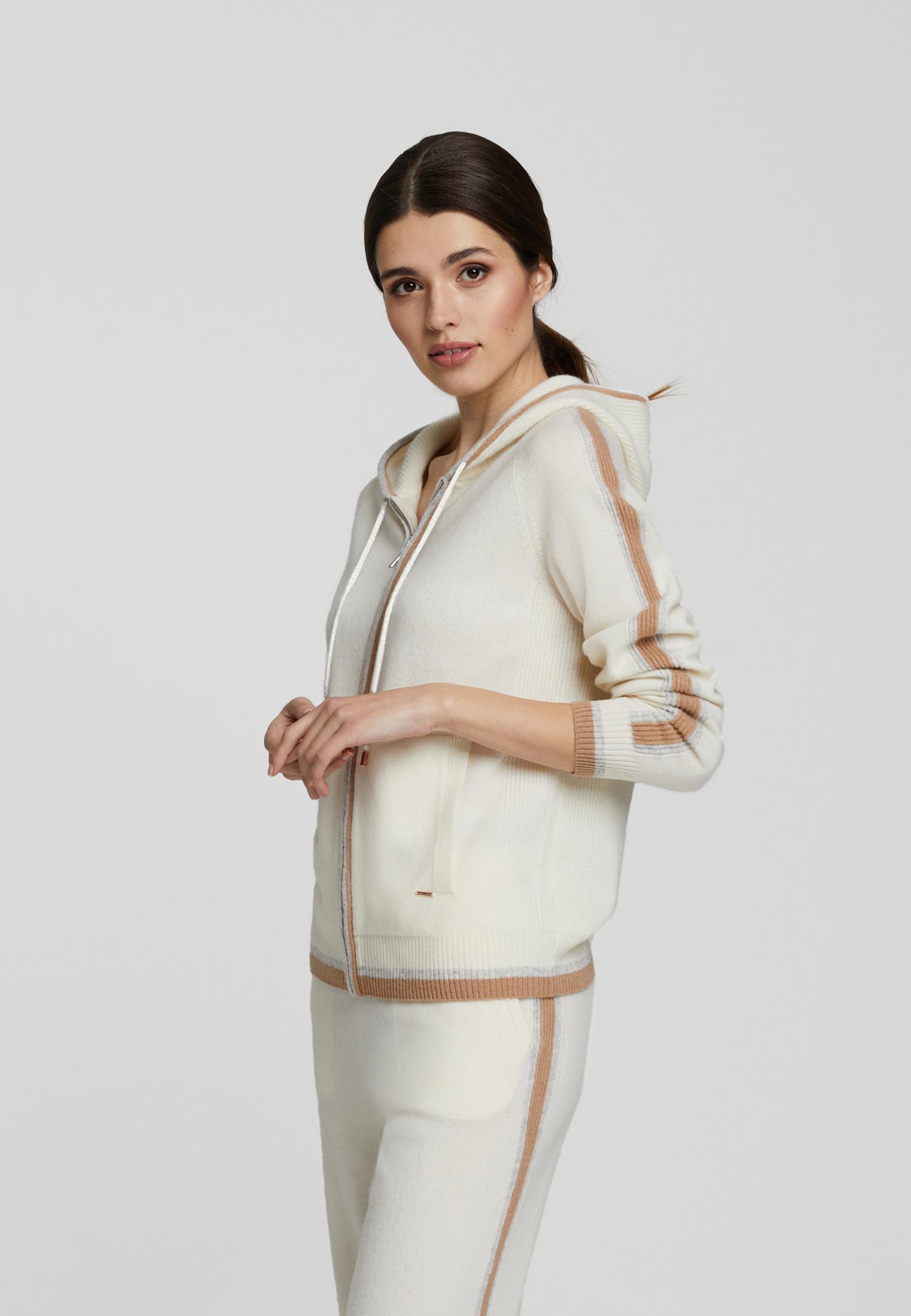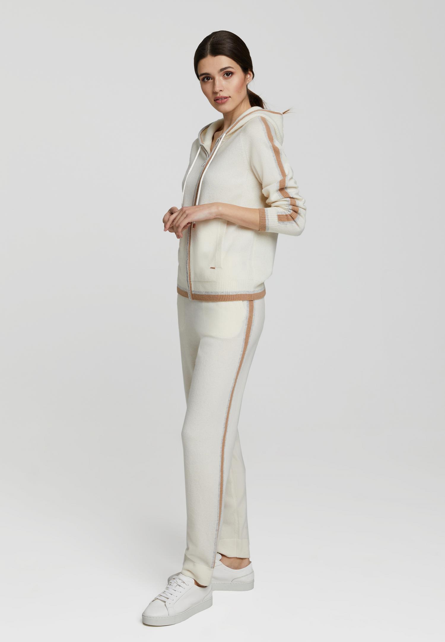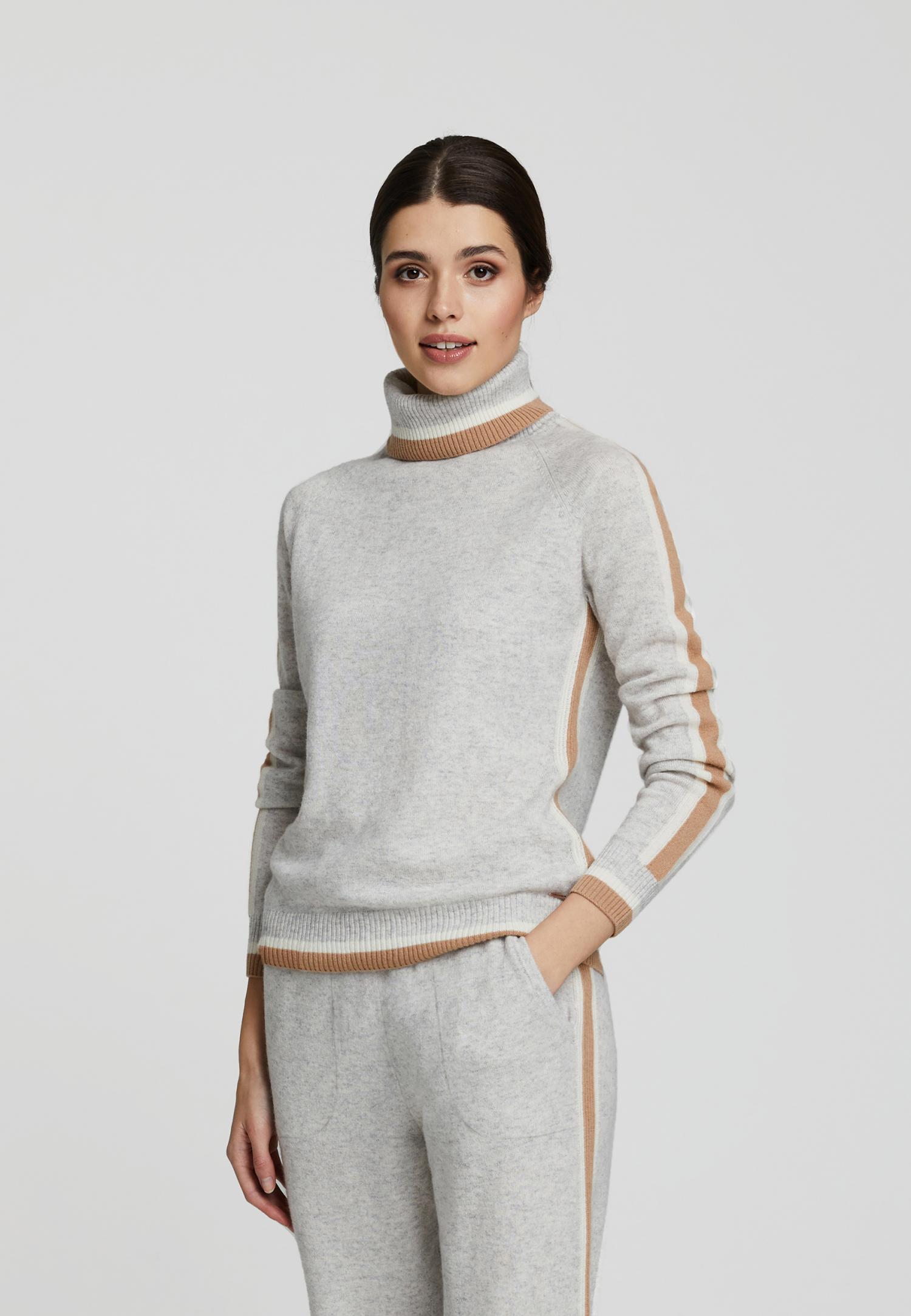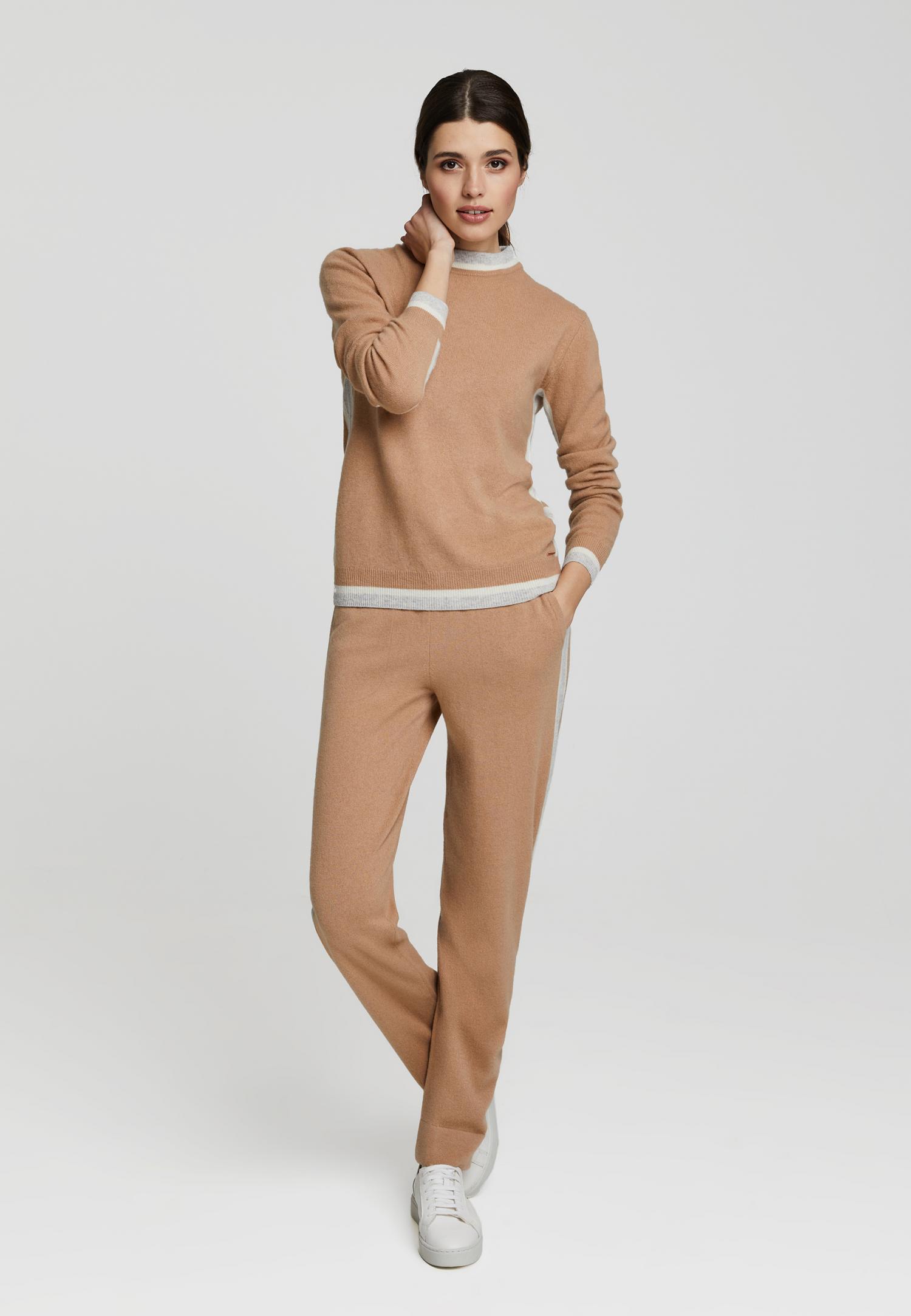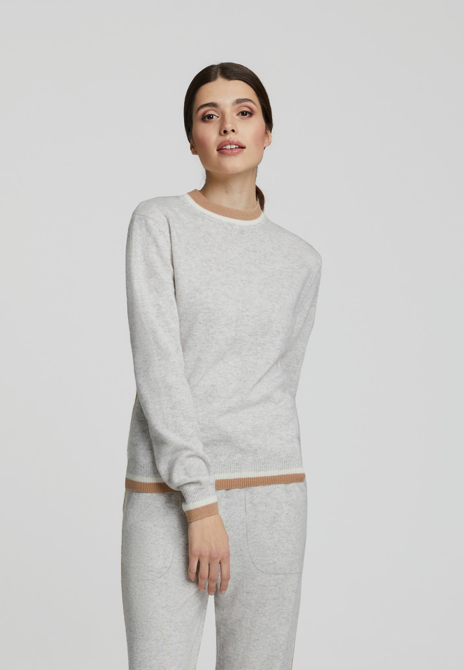Mõnusalt kerge pikkade varrukatega ümara kaelusega kampsun. Kootud luksuslikust kašmiiri- ja meriinovillasegu lõngast, mis annab tootele siidise pehmuse ja erakordse soojuse. Kontrastse triibumustriga intarsia detailid ühendavad endas sportlikkust ja elegantsi, luues saledama efekti. Stiilsed triibud soonikkoes kaeluse, mansettide ja allääre juures täiendavad kampsuni välimust. Kombineeri samasse seeriasse kuuluvate teiste toodetega. Toode on uhkusega disainitud Eestis! • Luksuslik ja pehme tekstuur