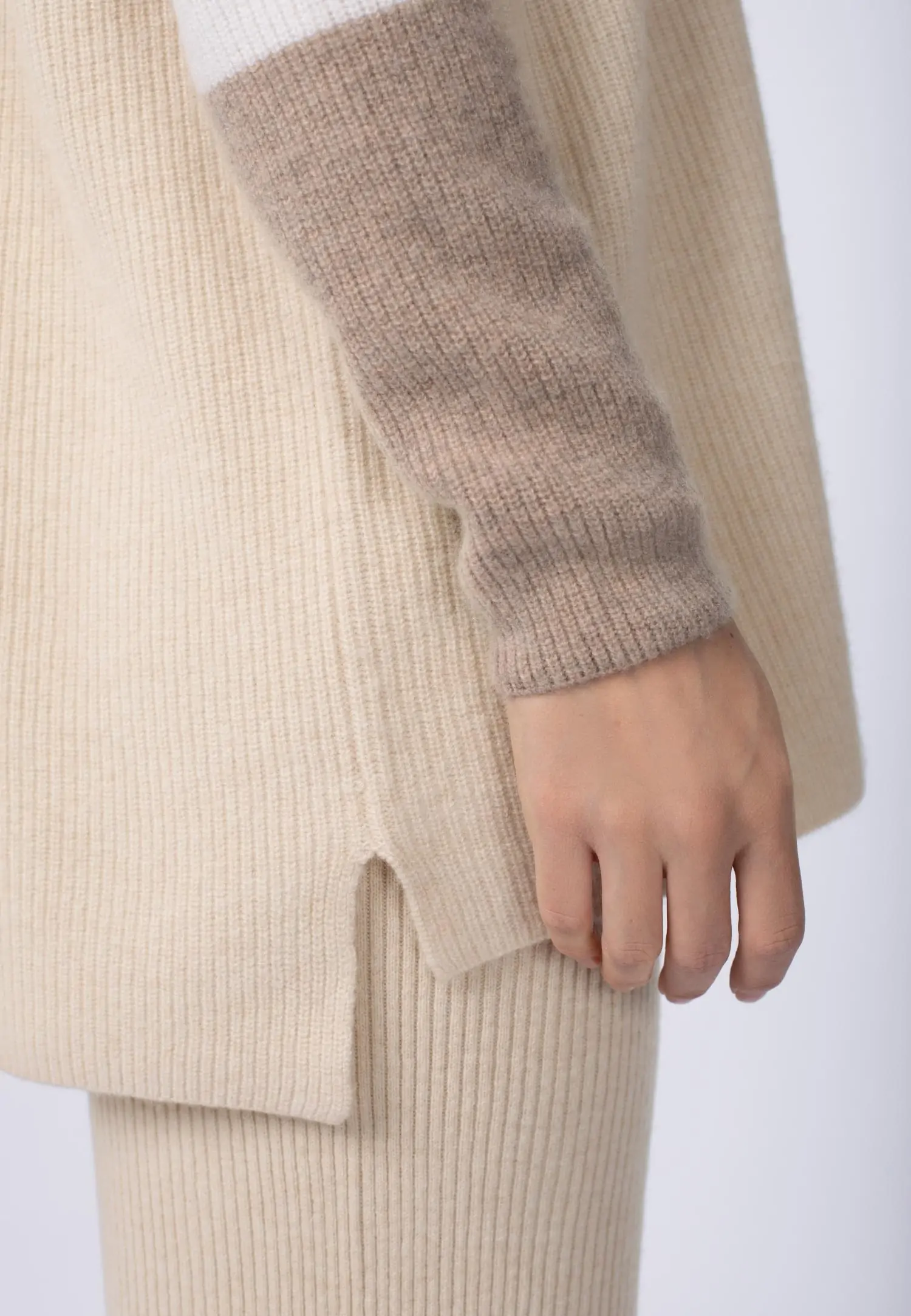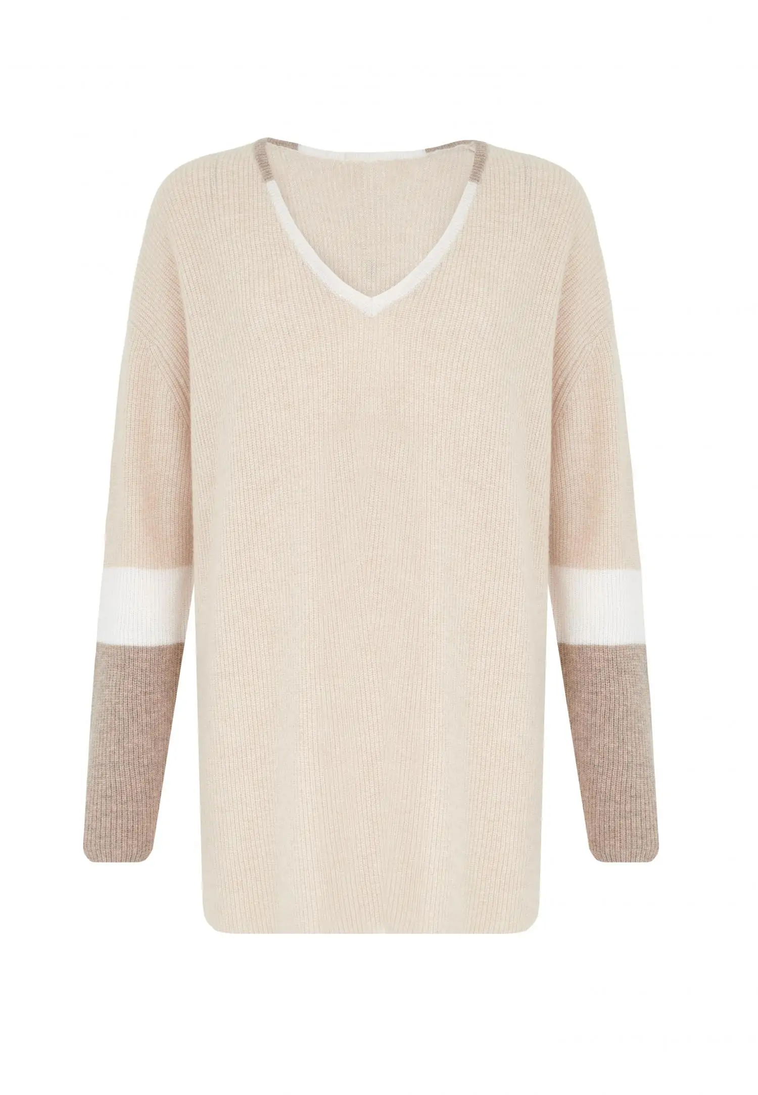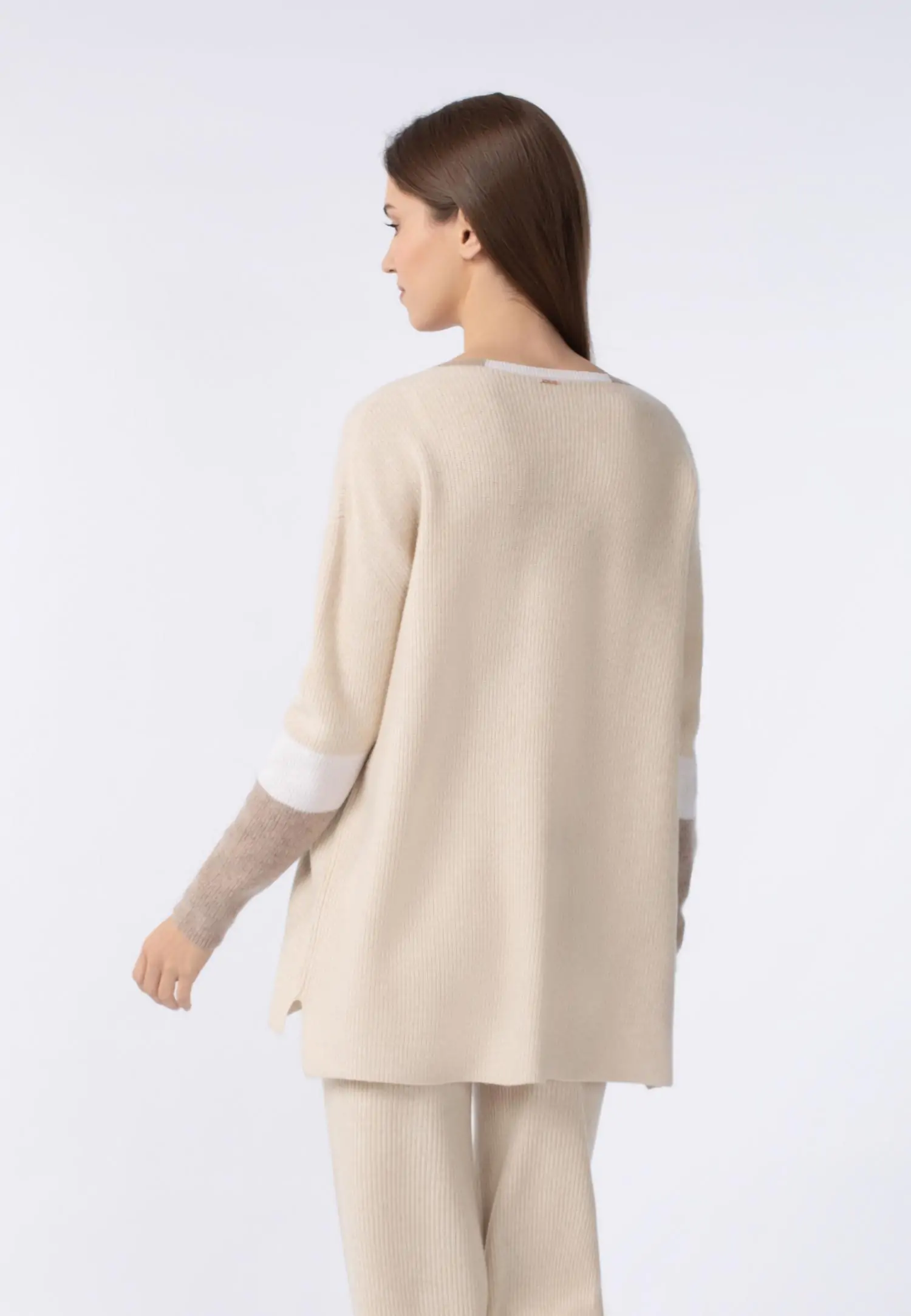 Mõnusalt kerge ja mugav pikendatud õlaga V-kaelusega avaralõikeline kampsun. Kootud soonikkoes luksuslikust kašmiiri- ja meriinovillasegu lõngast, mis annab tootele siidise pehmuse ja erakordse soojuse. Mängulised kontrasttriibud kaunistavad kaelust ja varrukaid. Küljelõhikud koos pikema seljaosaga toovad esile mängulisust ja mugavust. Kombineeri samasse seeriasse kuuluvate pükstega, et luua täiuslikult harmoneeruv ja pilkupüüdev komplekt. Toode on uhkusega disainitud Eestis!