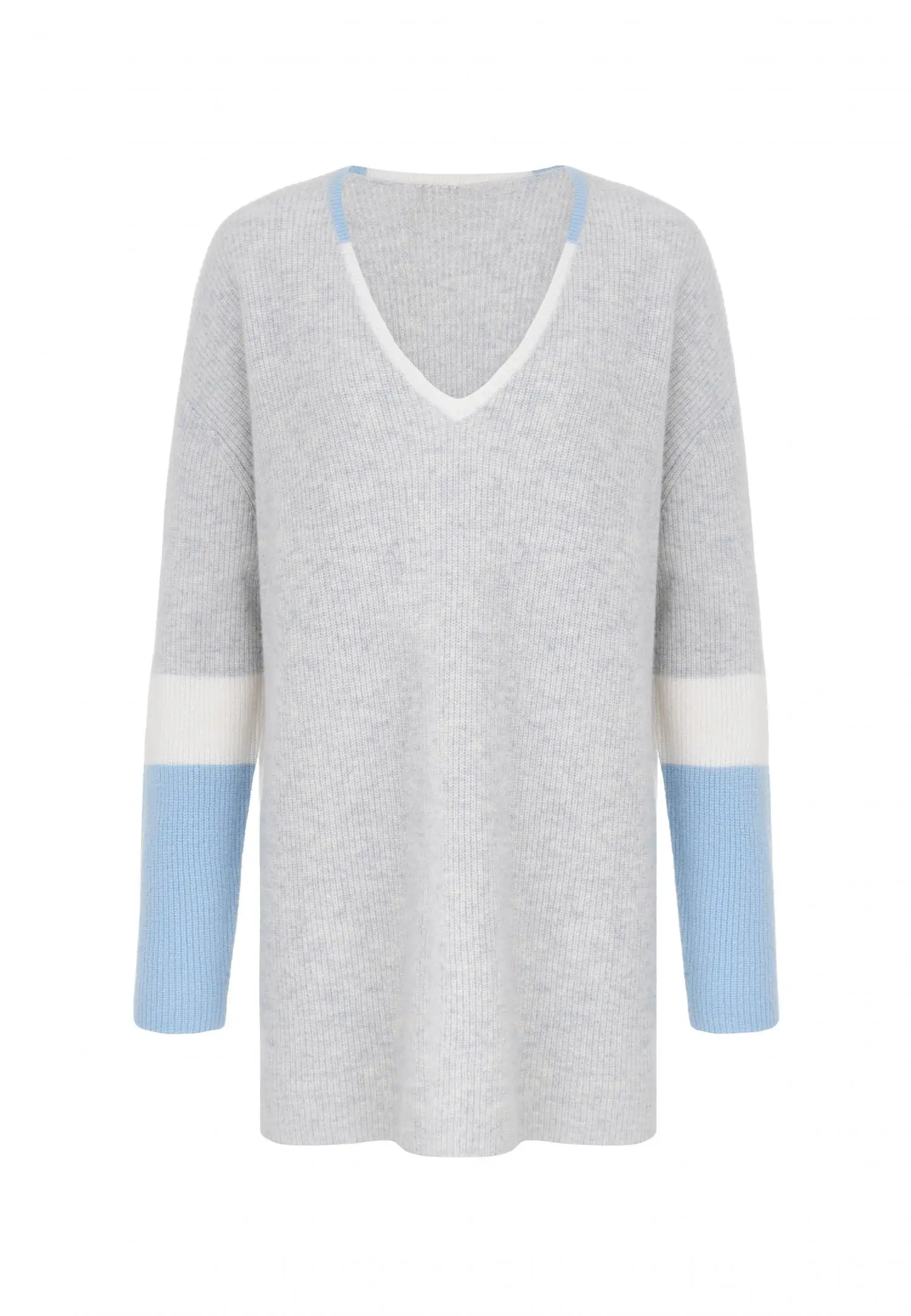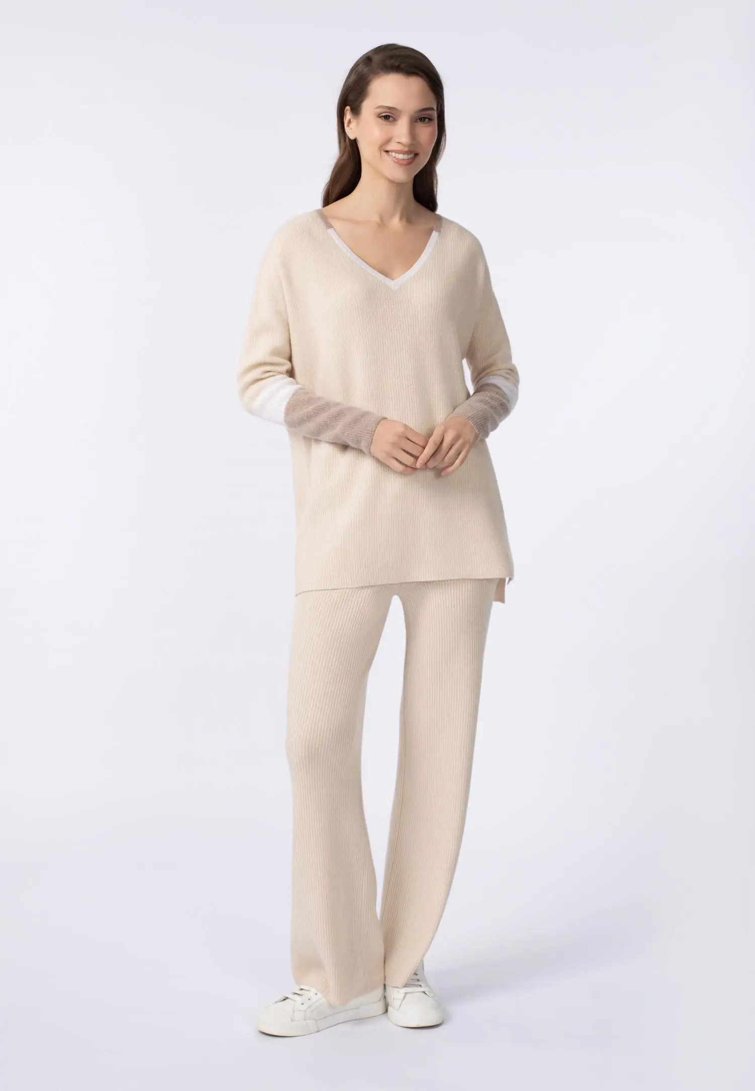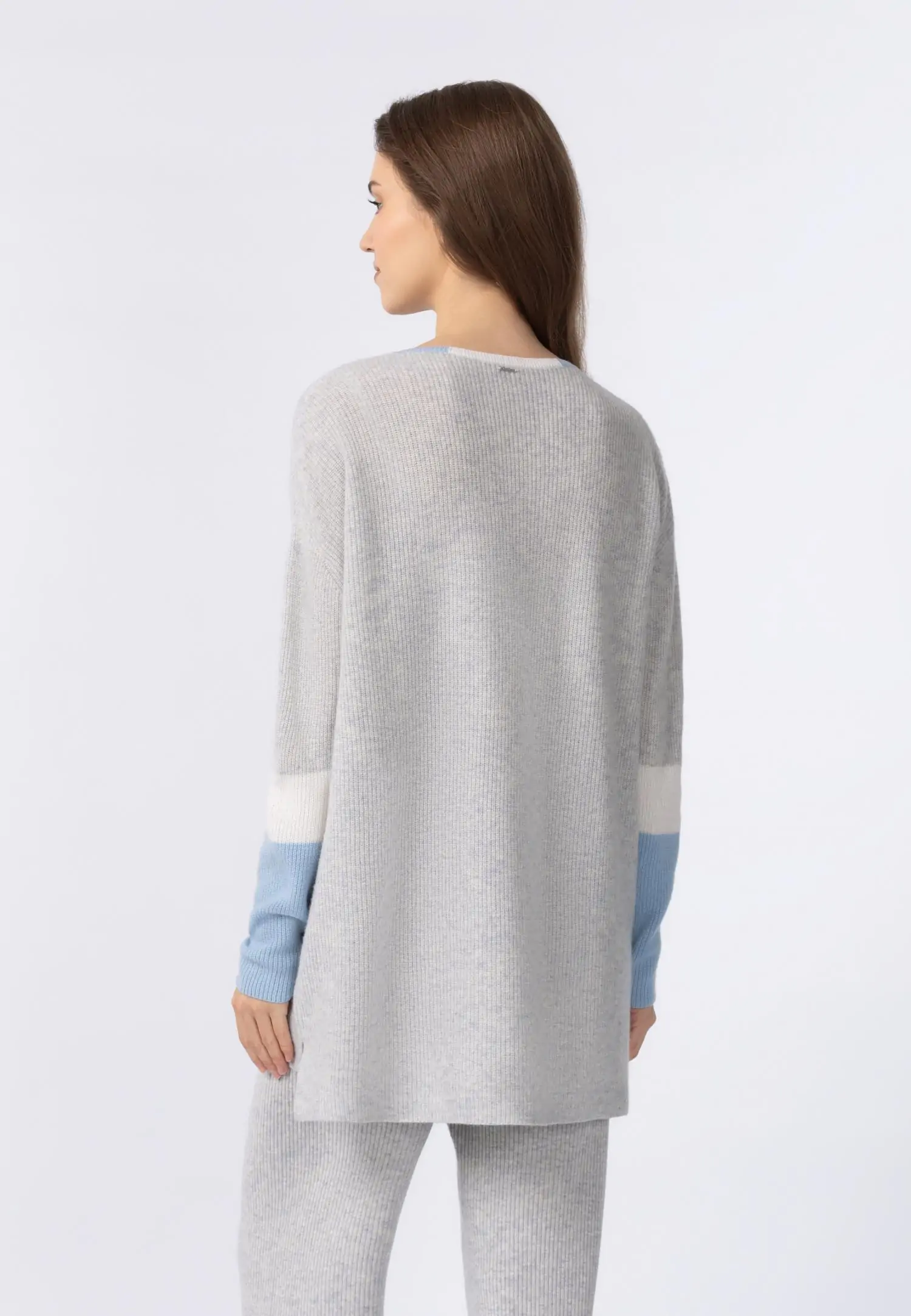 Mõnusalt kerge ja mugav pikendatud õlaga V-kaelusega avaralõikeline kampsun. Kootud soonikkoes luksuslikust kašmiiri- ja meriinovillasegu lõngast, mis annab tootele siidise pehmuse ja erakordse soojuse. Mängulised kontrasttriibud kaunistavad kaelust ja varrukaid. Küljelõhikud koos pikema seljaosaga toovad esile mängulisust ja mugavust. Kombineeri samasse seeriasse kuuluvate pükstega, et luua täiuslikult harmoneeruv ja pilkupüüdev komplekt. Toode on uhkusega disainitud Eestis!