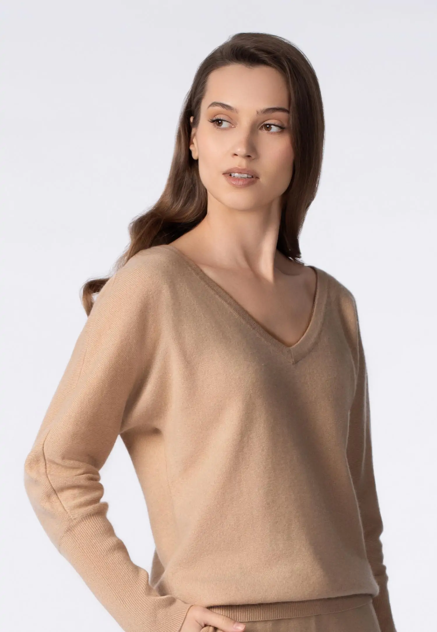 Eksklusiivse kašmiirlõnga sisaldusega V-kaelusega sviitril on täispikad kimonolõikelised varrukad ja soonikkude nii kehaosa kui varruka allääres. Kombineeri samasse seeriasse kuuluvate pükstega. Toode...