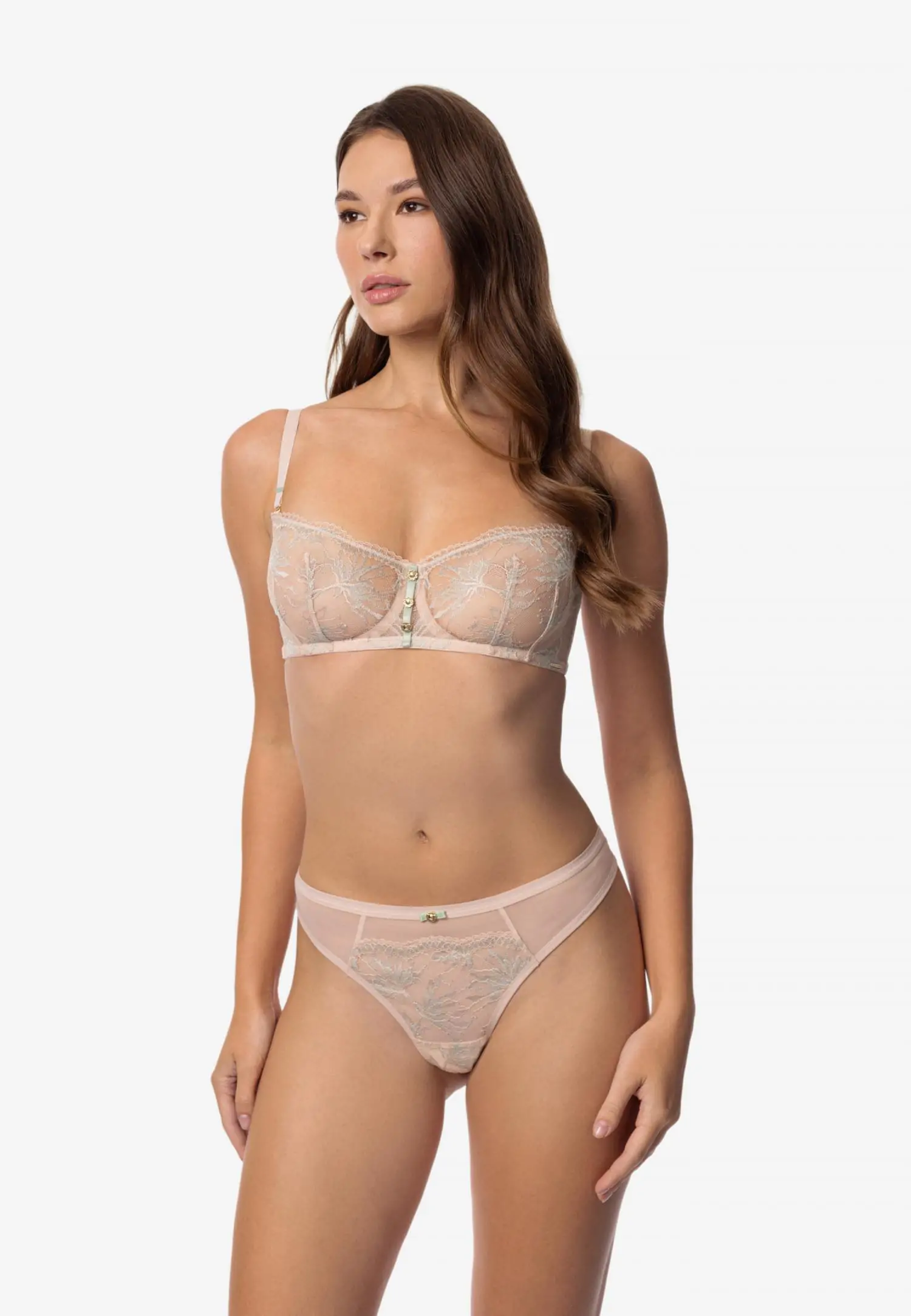 Tugikaartega balconette rinnahoidja. Silikoonriba hoiab mugavalt paigal ka ilma õlapaelteta. Kaasas on eemaldatavad õlapaelad ja lisaks silikoonist õlapaelte komplekt. Pehmel roosal põhjal õrn pits ja mündirohelised detailid loovad kerge ning värske ilme. ANTOINETTE ühendab läbikumava delikaatsuse ja vaoshoitud enesekindluse. Toode on disainitud ja arendatud Eestis!