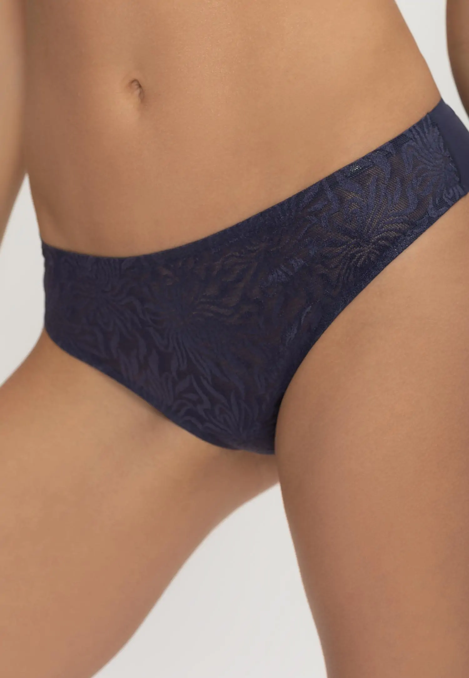 Brazilia-n lõikeliste pükste esiosa on pitskangast. Tagadetaili jalaava on kahekordsest kergelt läbikumavast võrkkangast, vööjoon pehme ja ilma kummiservata.