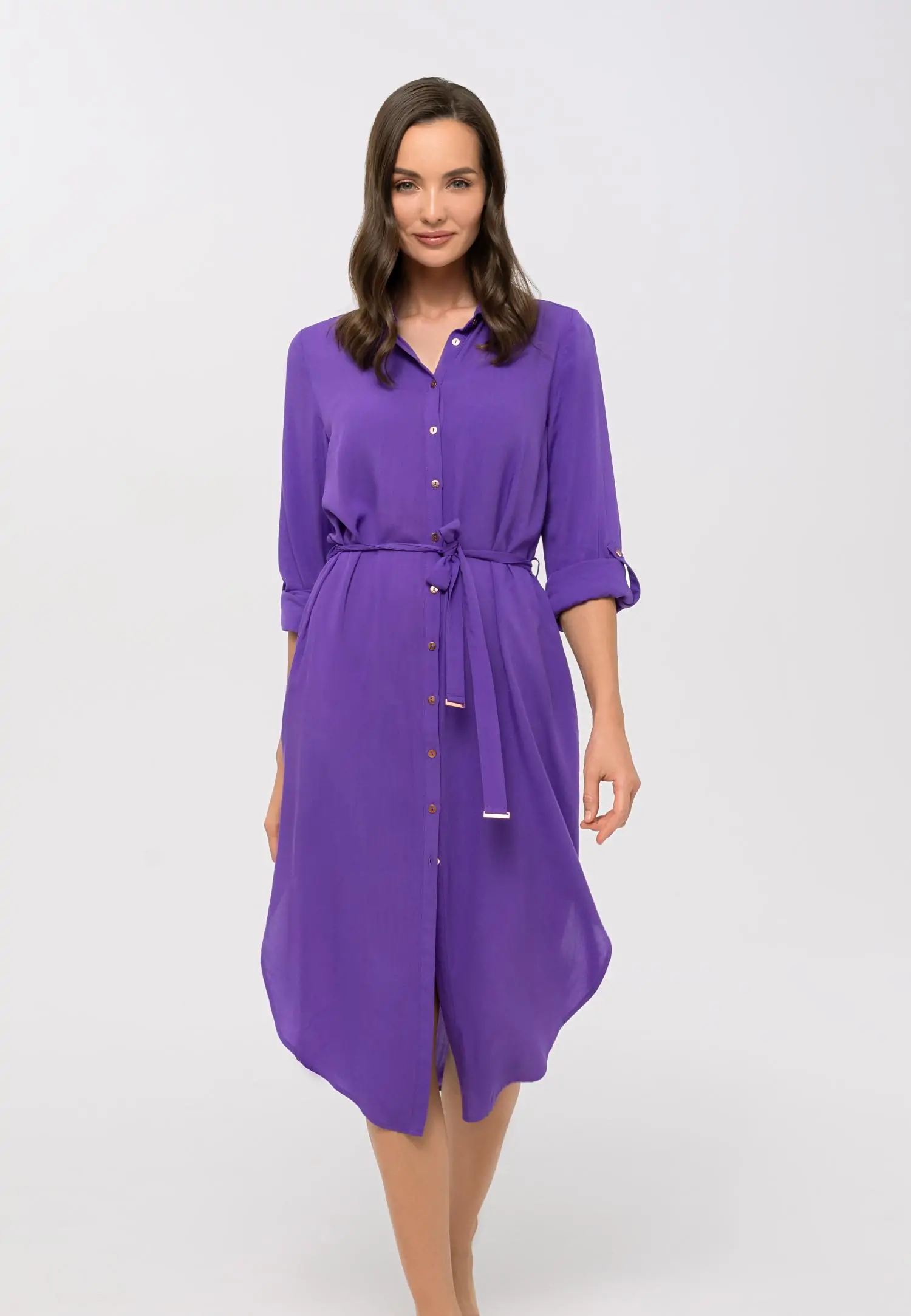Pehmest ja hingavast materjalid viskooskleit. Kleidil on krae ja väikesed kuldsed nööbid. Midi-pikkusega suvekleidi pihaosa rõhutab kuldsete aksessuaaridega äravõetav vöö. Täispikad varrukad on regule...