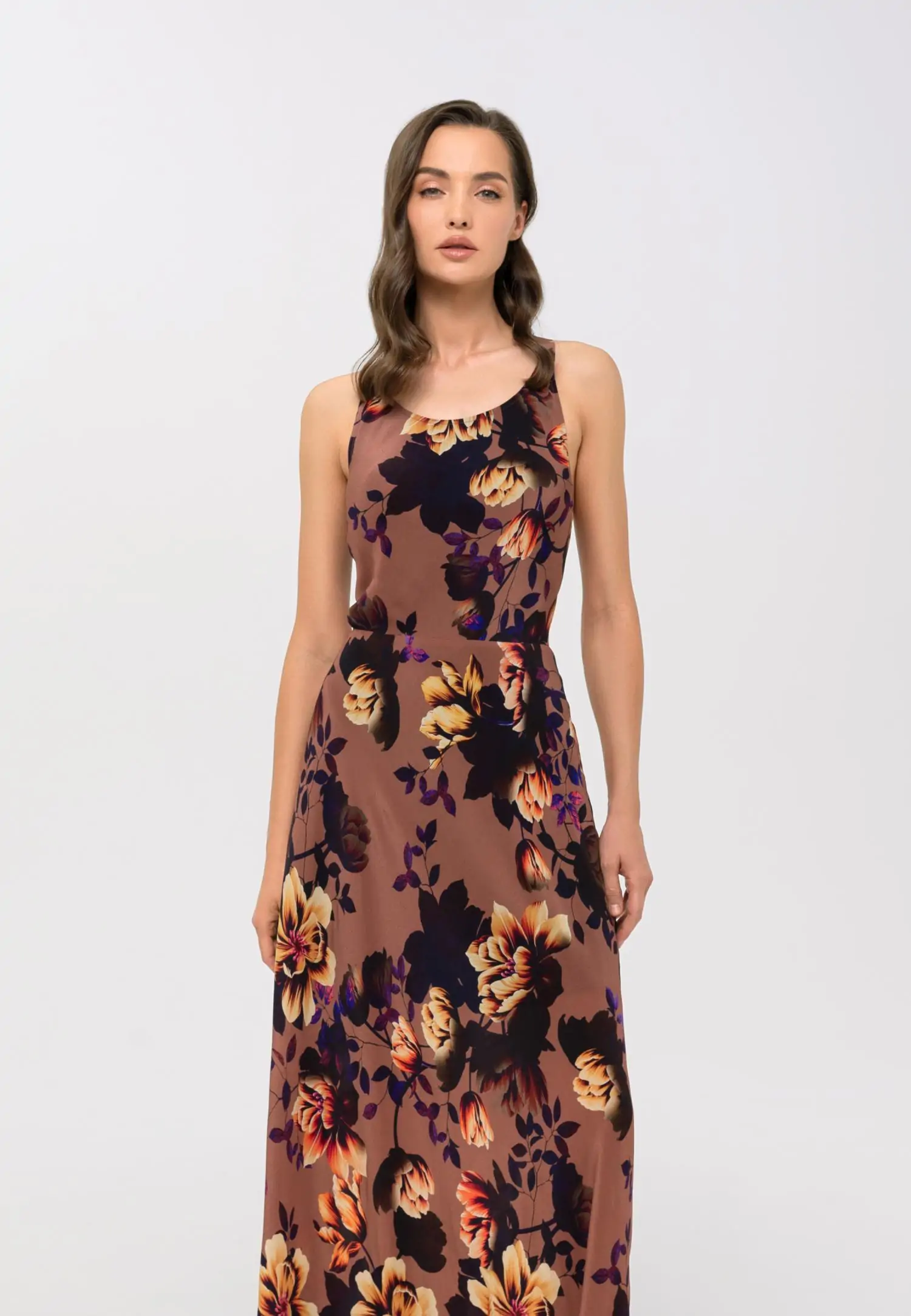 FLOWER MANIA kollektsiooni muster on loodud Itaalia disainimaja poolt ja on spetsiaalselt loodud Marc & André jaoks. Roostepruun taust on inspireeritud hooaja värvitrendidest ja loob ajatu, harmoonilise ilme. Toon-toonis indigo värvi vooder ja õlapaelad täiustavad lehemotiive, samal ajal kui tulbimuster loob dünaamilise ülemineku kollasest oranžini. Metalsed aksessuaarid lisavad peent aktsenti ning kerge, õrnalt läikiv kangas tagab mugavuse ja elegantse välimuse.
