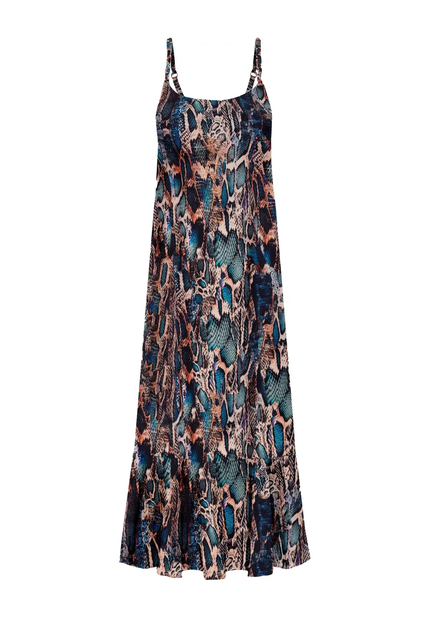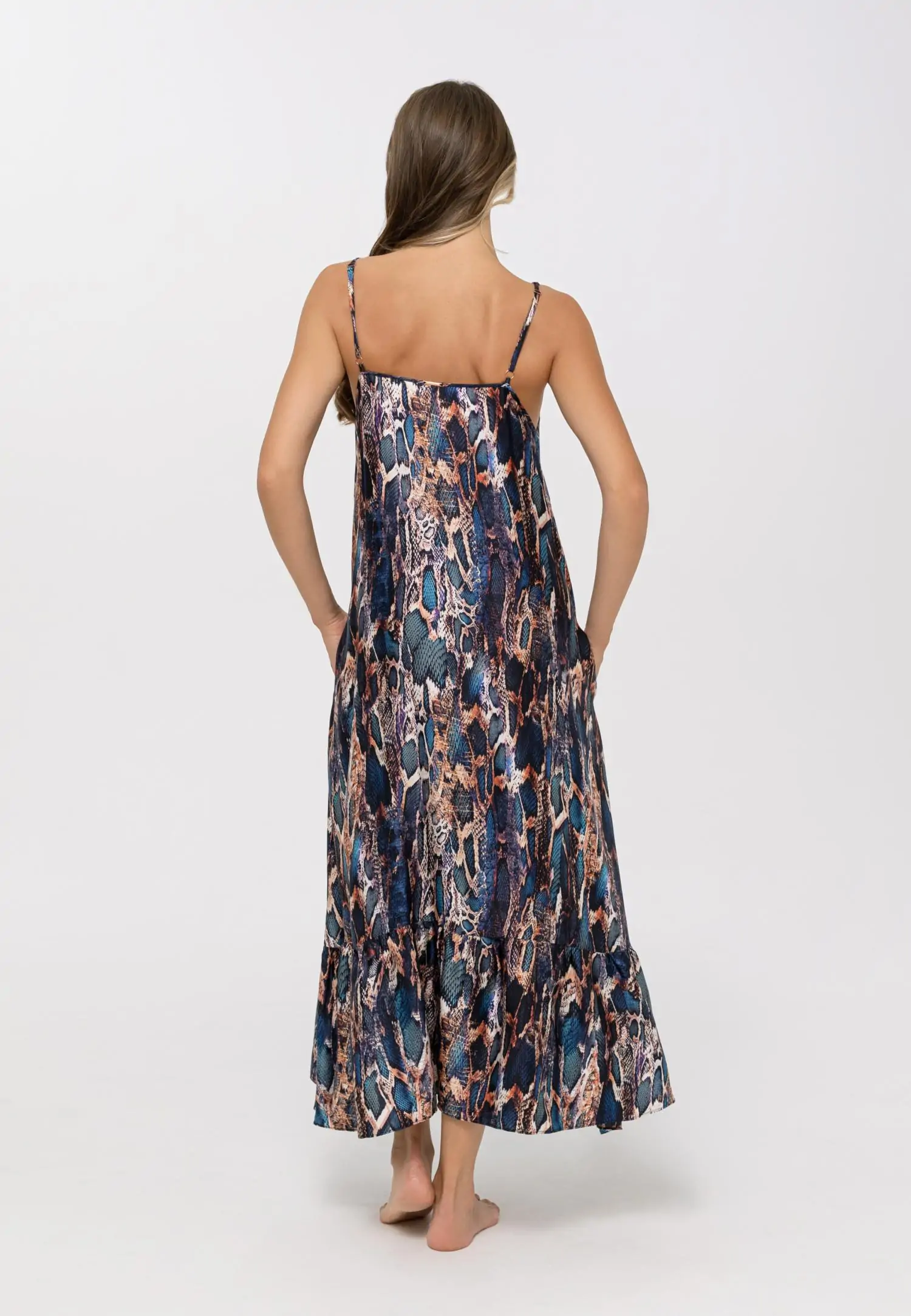 Imelise mustriga maxi pikkuses maani kleit, millele on lisatud praktilised taskud. Vaba ja lendleva lõikega. Reguleeritava pikkusega õlapaelad.