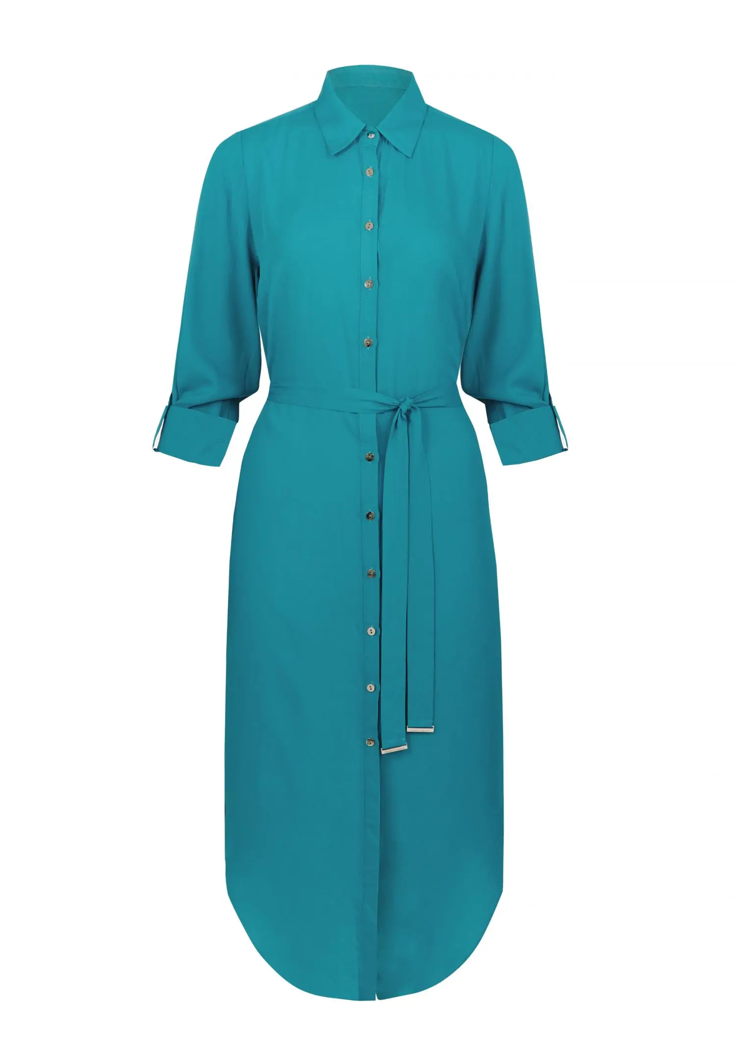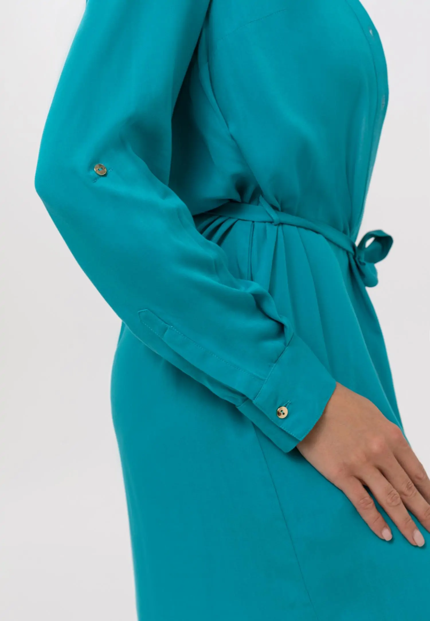Pehmest ja hingavast materjalid viskooskleit. Kleidil on krae ja väikesed kuldsed nööbid. Midi-pikkusega suvekleidi pihaosa rõhutab kuldsete aksessuaaridega äravõetav vöö. Täispikad varrukad on regule...
