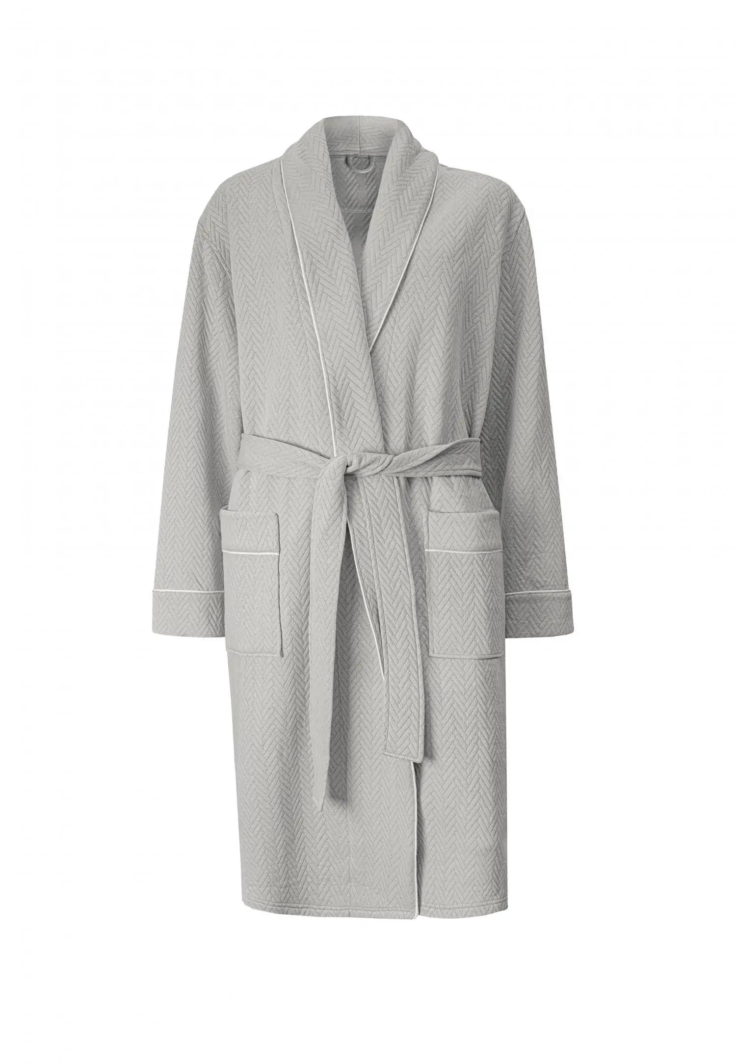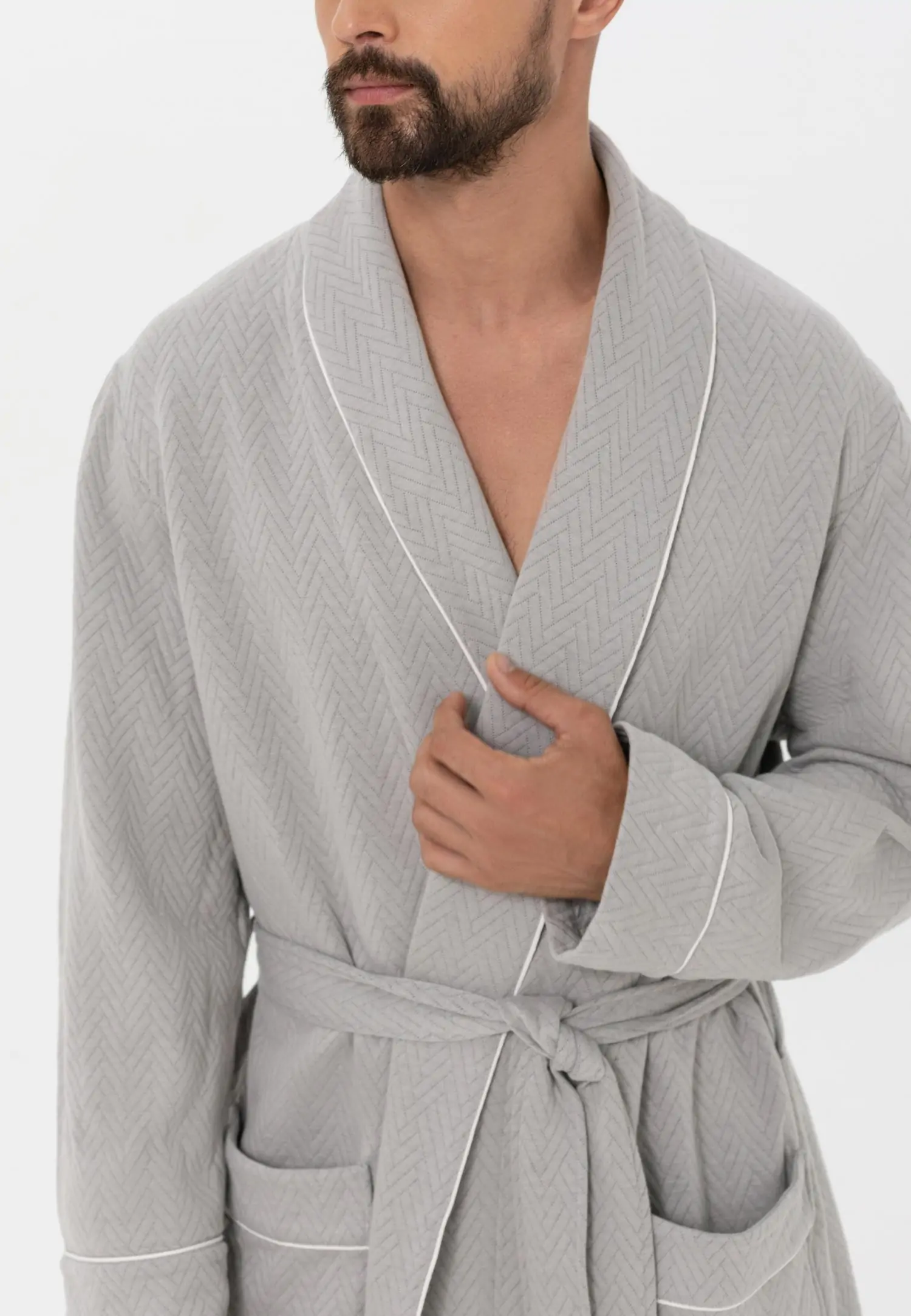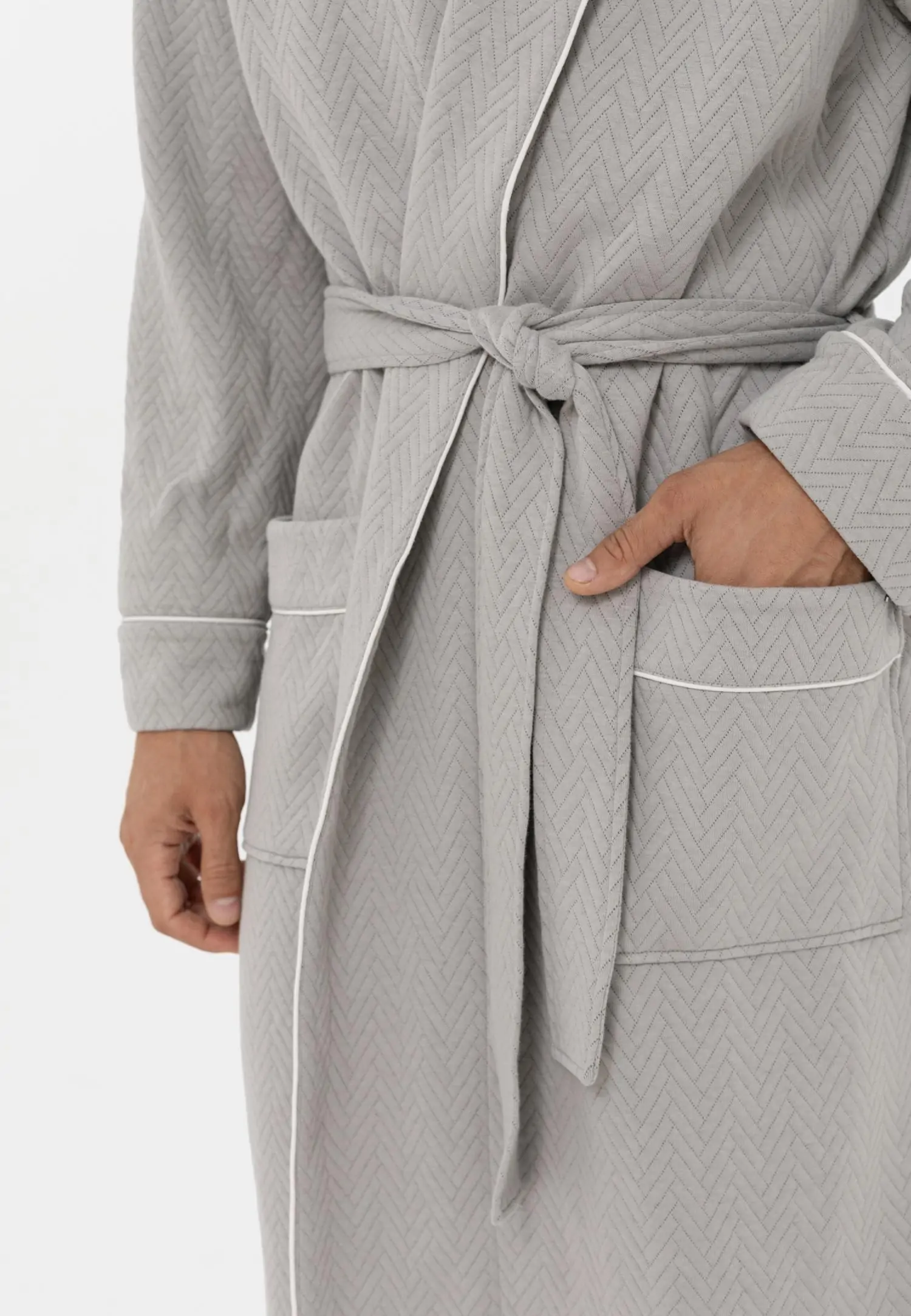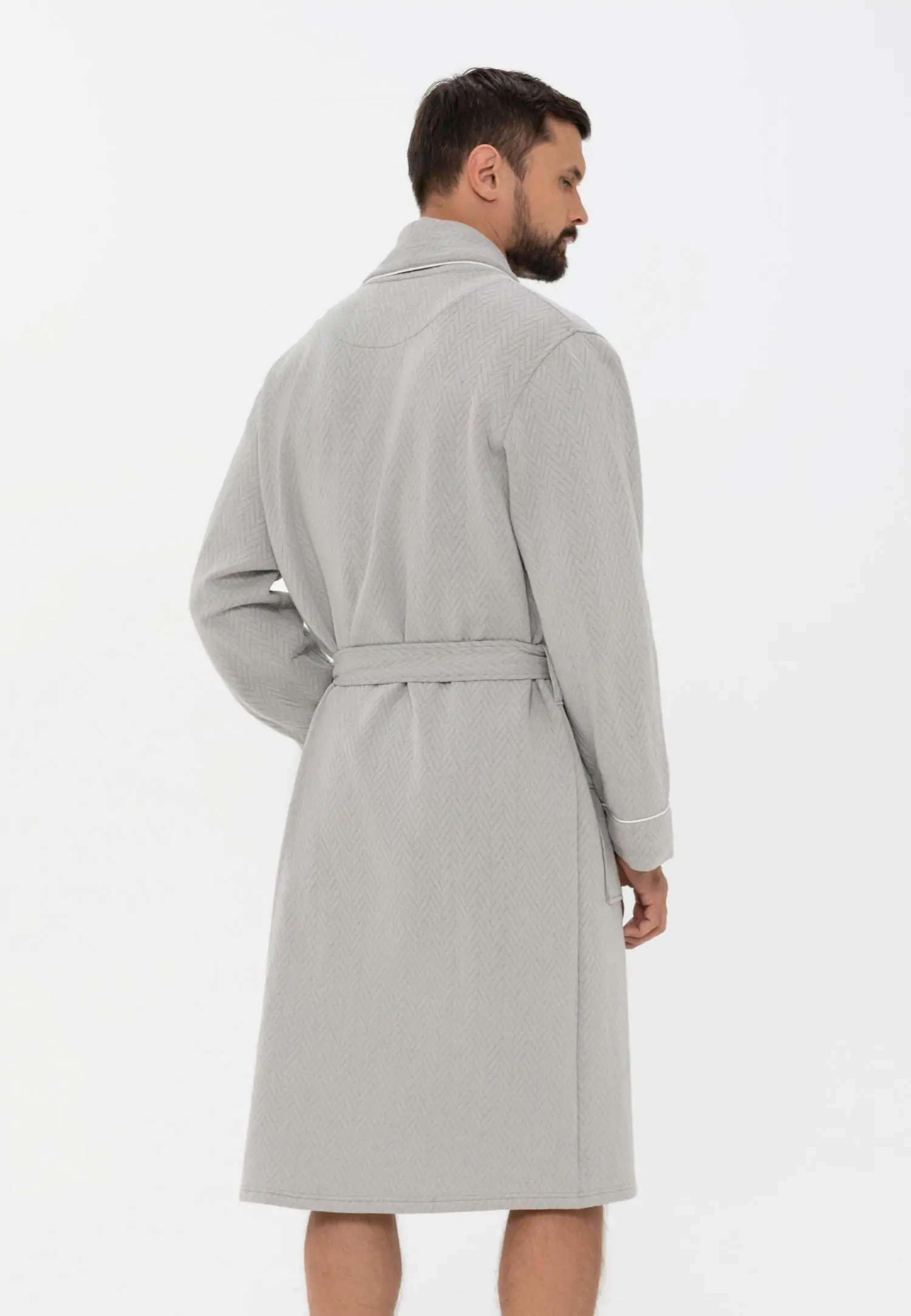 Мужской халат из хлопка без пуговиц, с поясом. Длина чуть ниже уровня колен. Спереди накладные карманы. Воротник-шалька. Фактурная ткань с рисунком