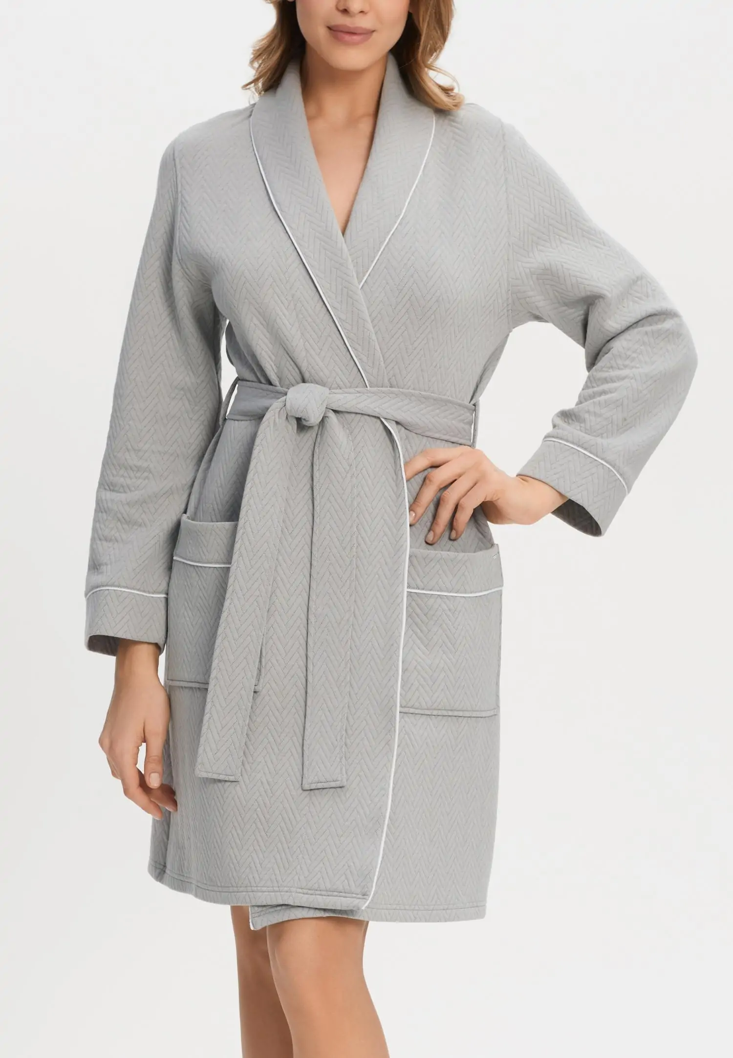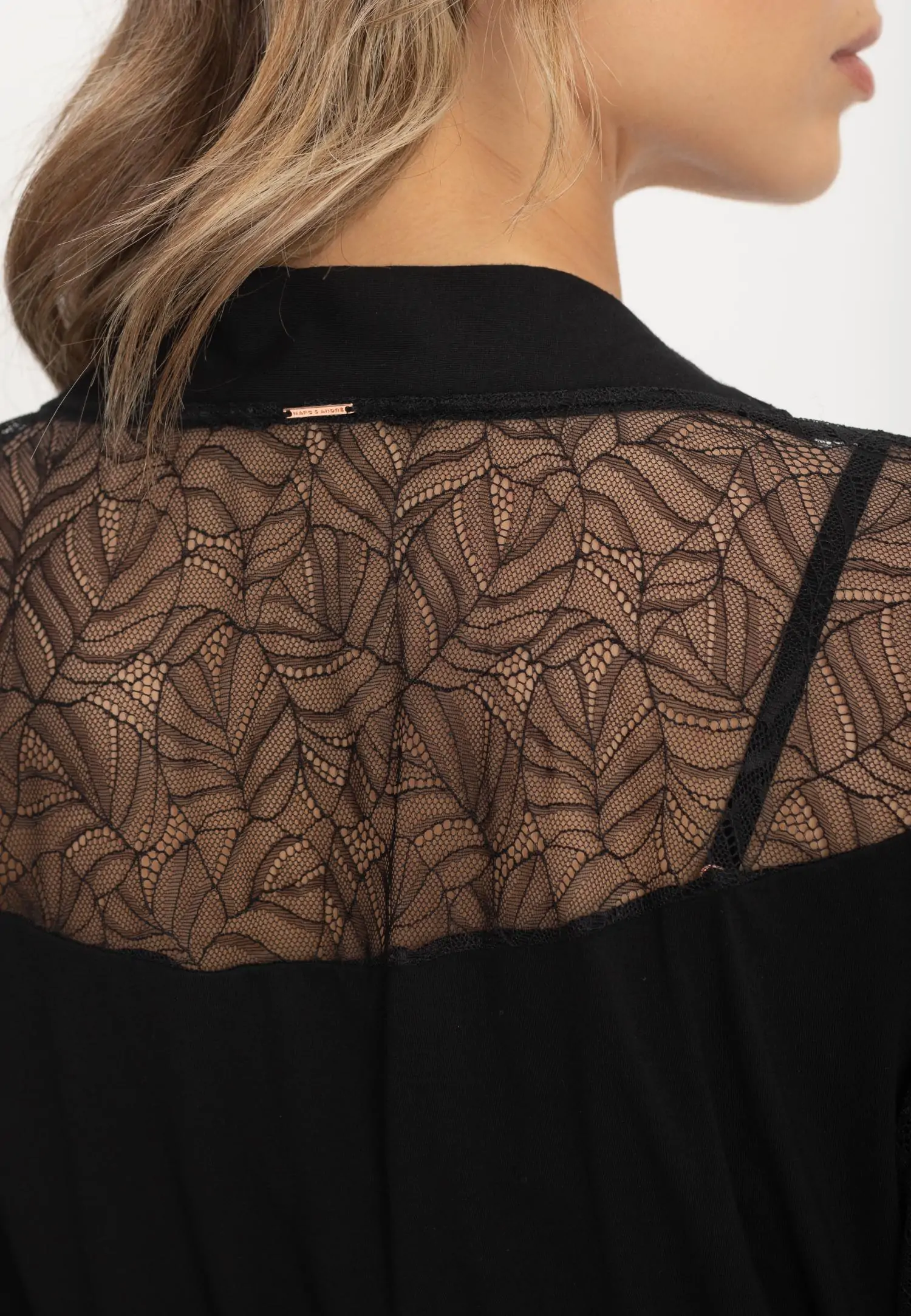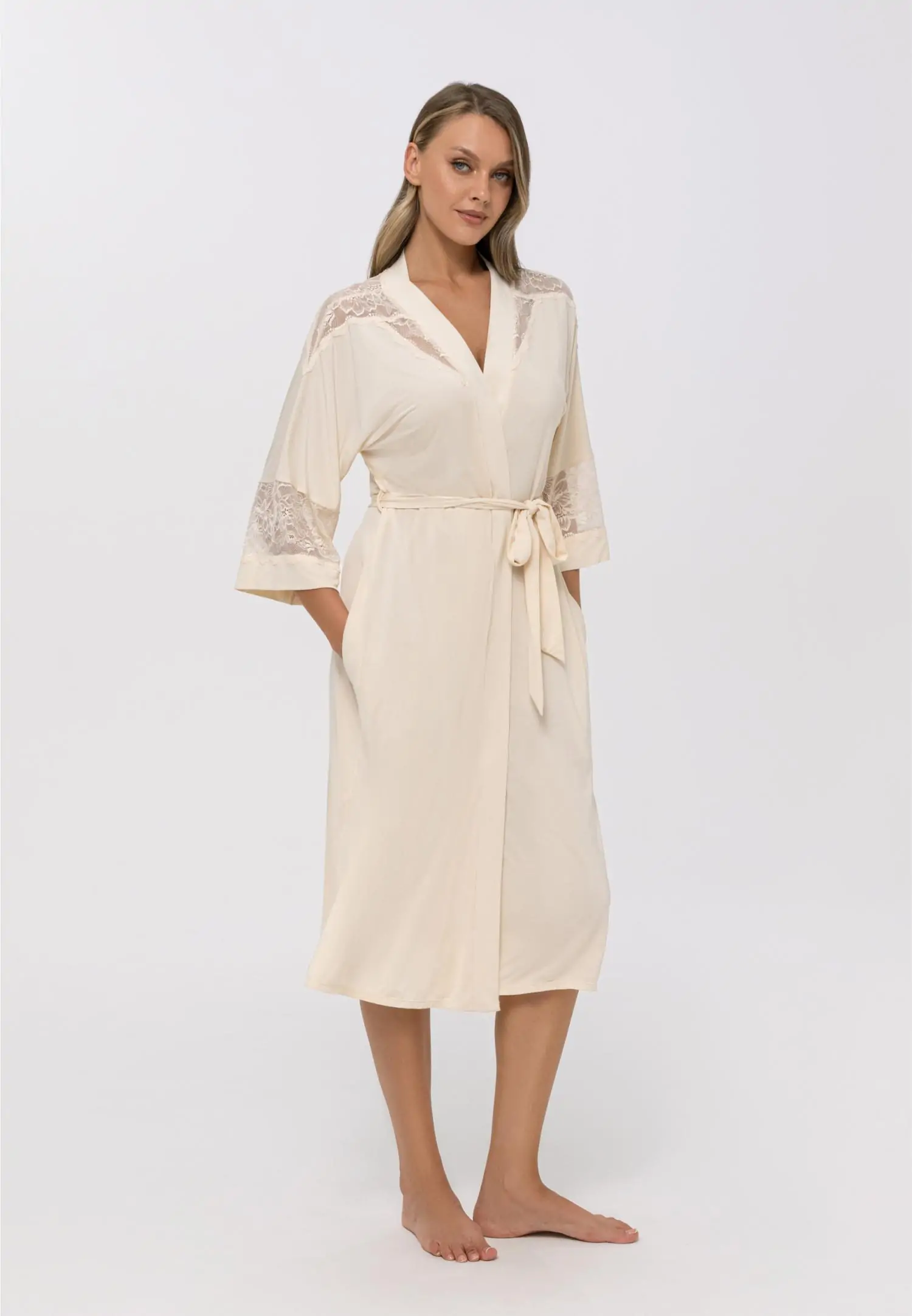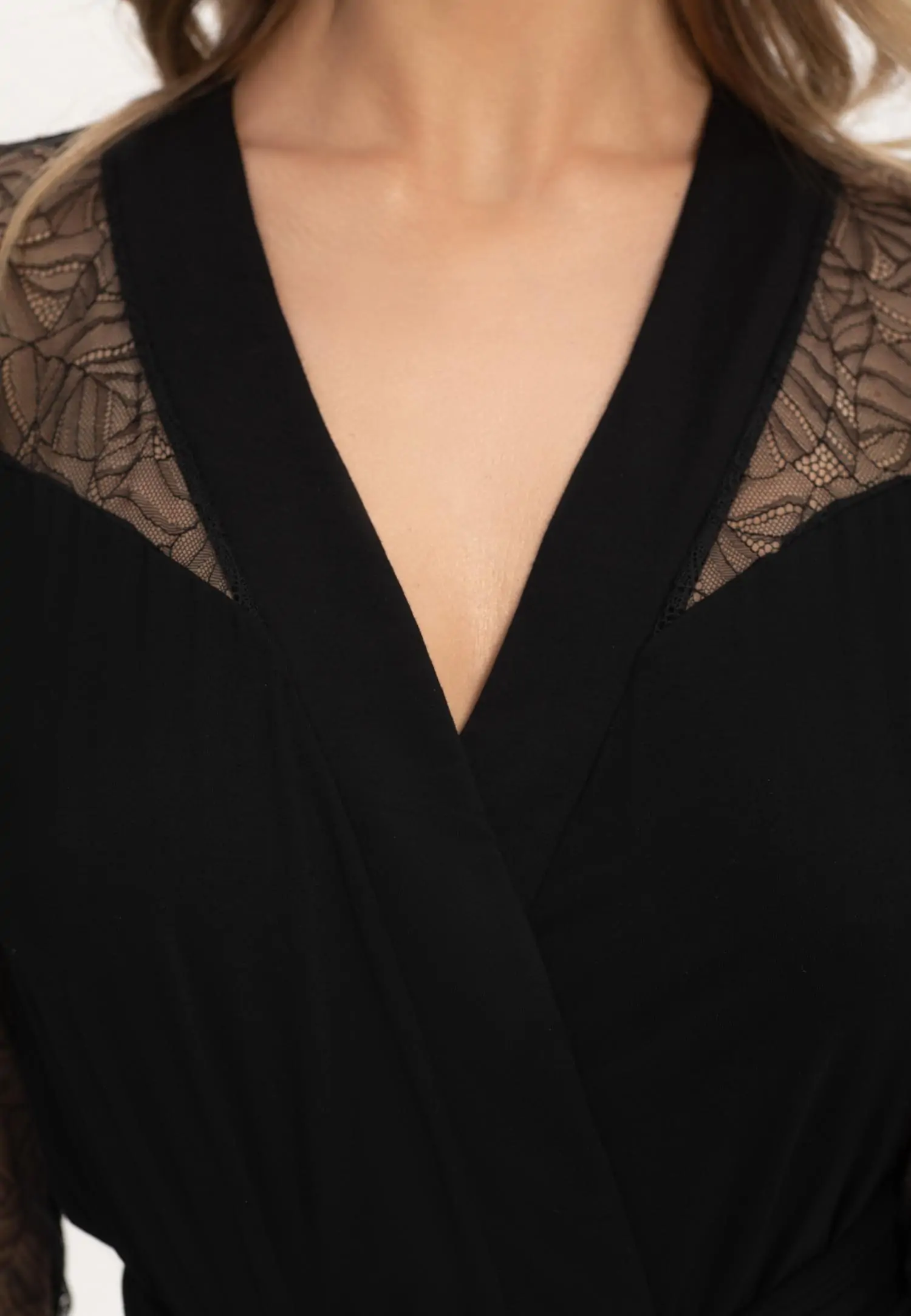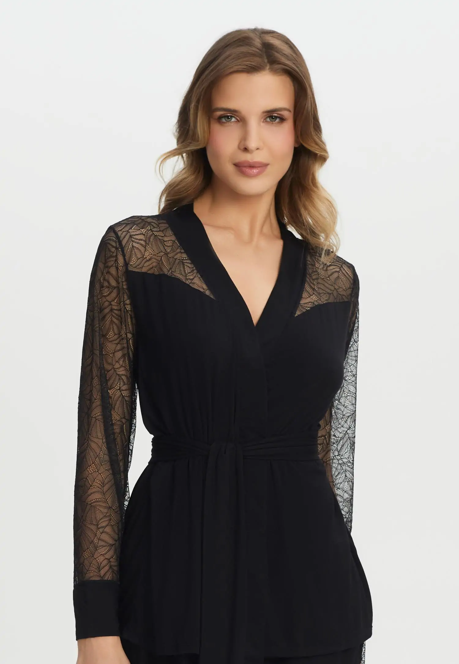 Короткое кимоно прямого кроя на поясе из нежнейшей вискозы. Кокетки из тончайшего кружева-паутинки расположены на передней и задней части кимоно. Втачной рукав выполнен из прозрачного кружева, манжеты - из основной ткани. Длина ниже середины бедра. Спереди накладные карманы