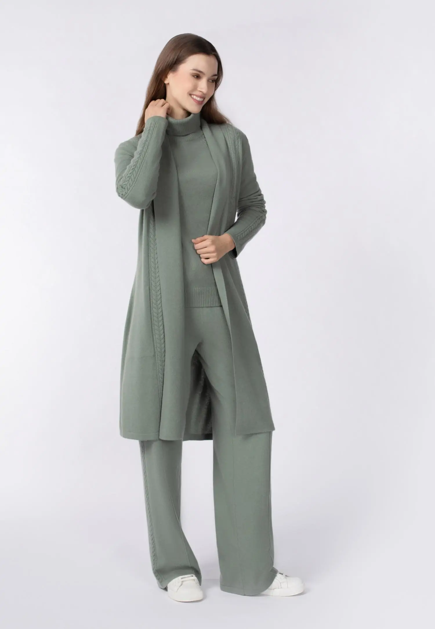 Дизайнерские детали в виде аккуратных кос украшают кардиган, создавая гармоничный тандем мягкости и эксклюзивности.