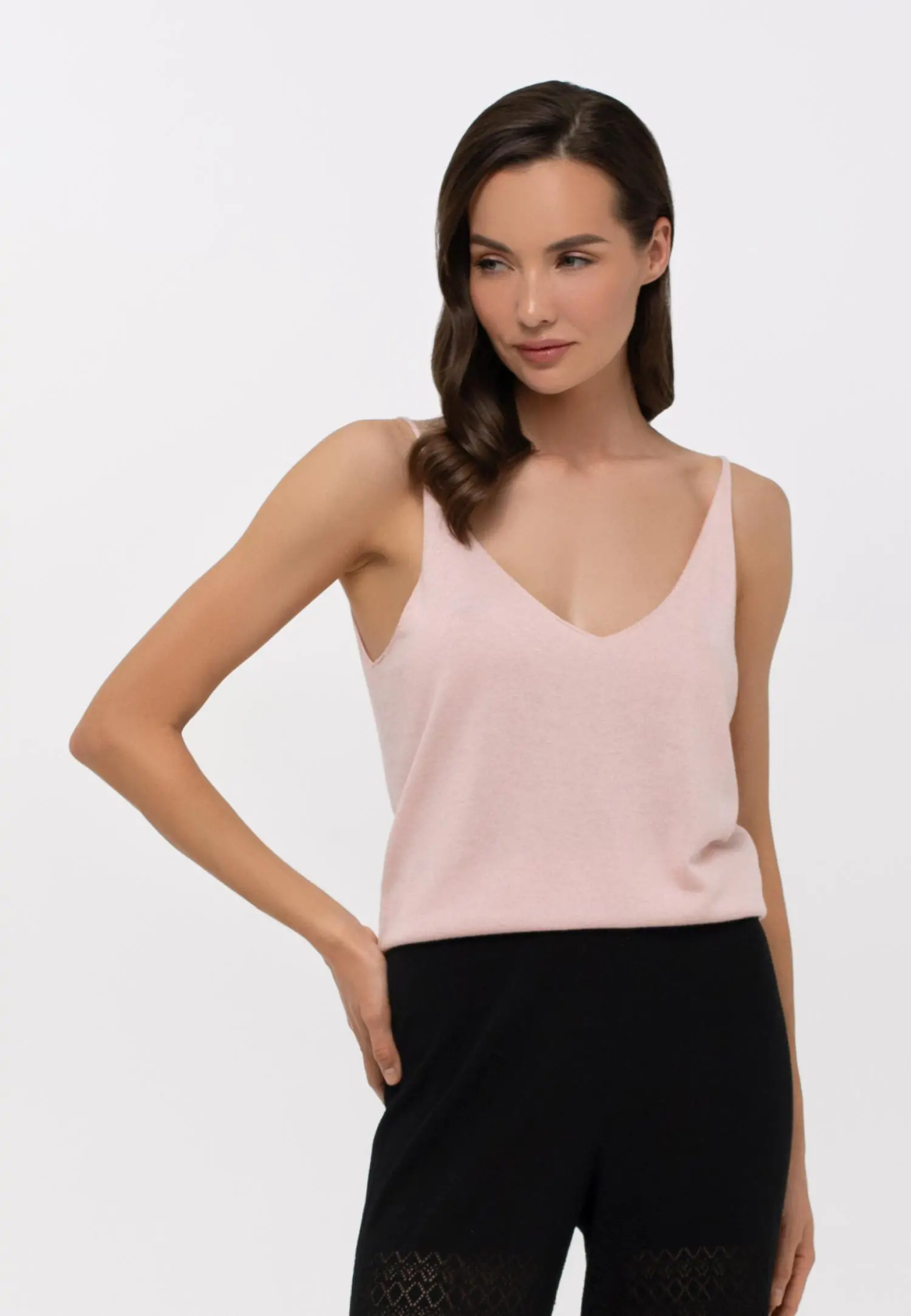 Мягкий топ свободного кроя выполнена из нежного шелка и кашемира. Невероятно гладкий материал дарит ощущущения  комфорта на протяжении всего дня. Тонкие бретели, глубокие V-образные вырезы н...