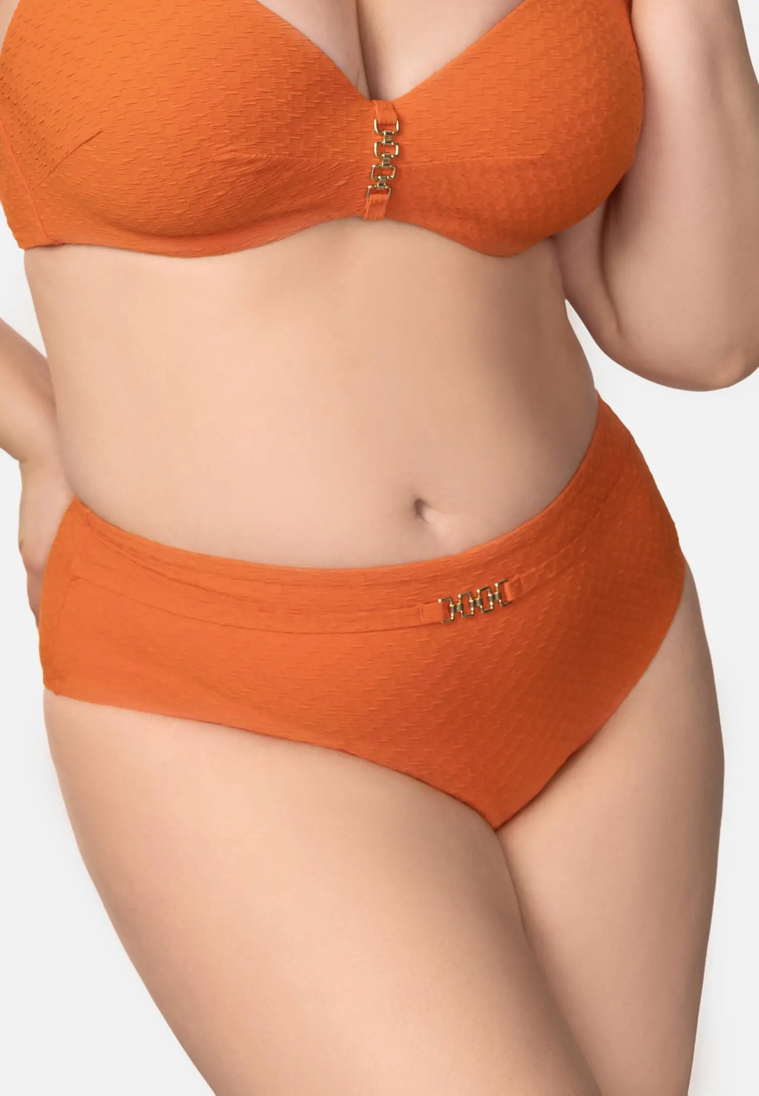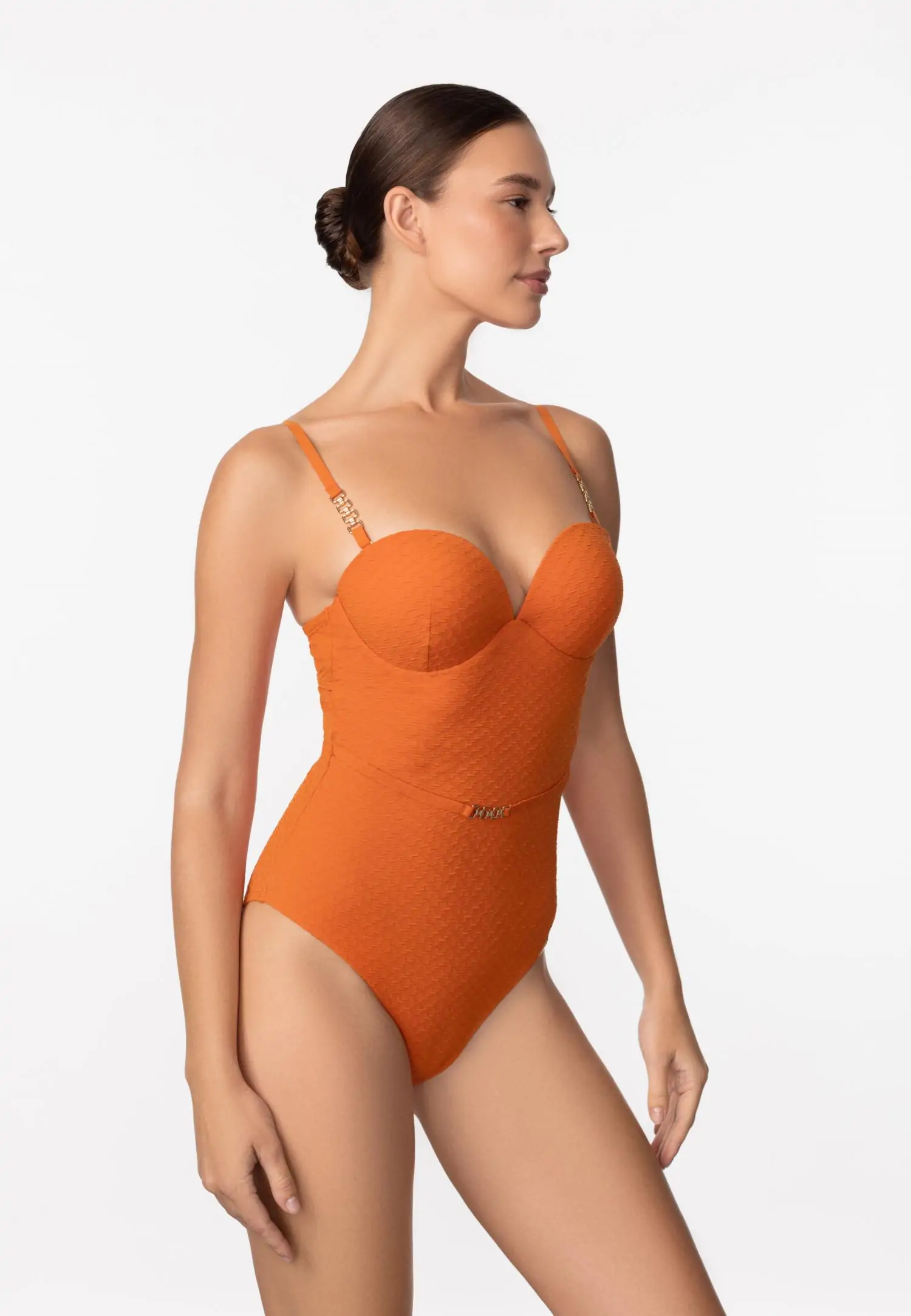 Формованная чашка на косточках. Углубленная линия декольте. По центру между чашек аксессуар. Широкие бретели с поролоновой вставкой для комфортной и уверенной посадки. На спине застежка.