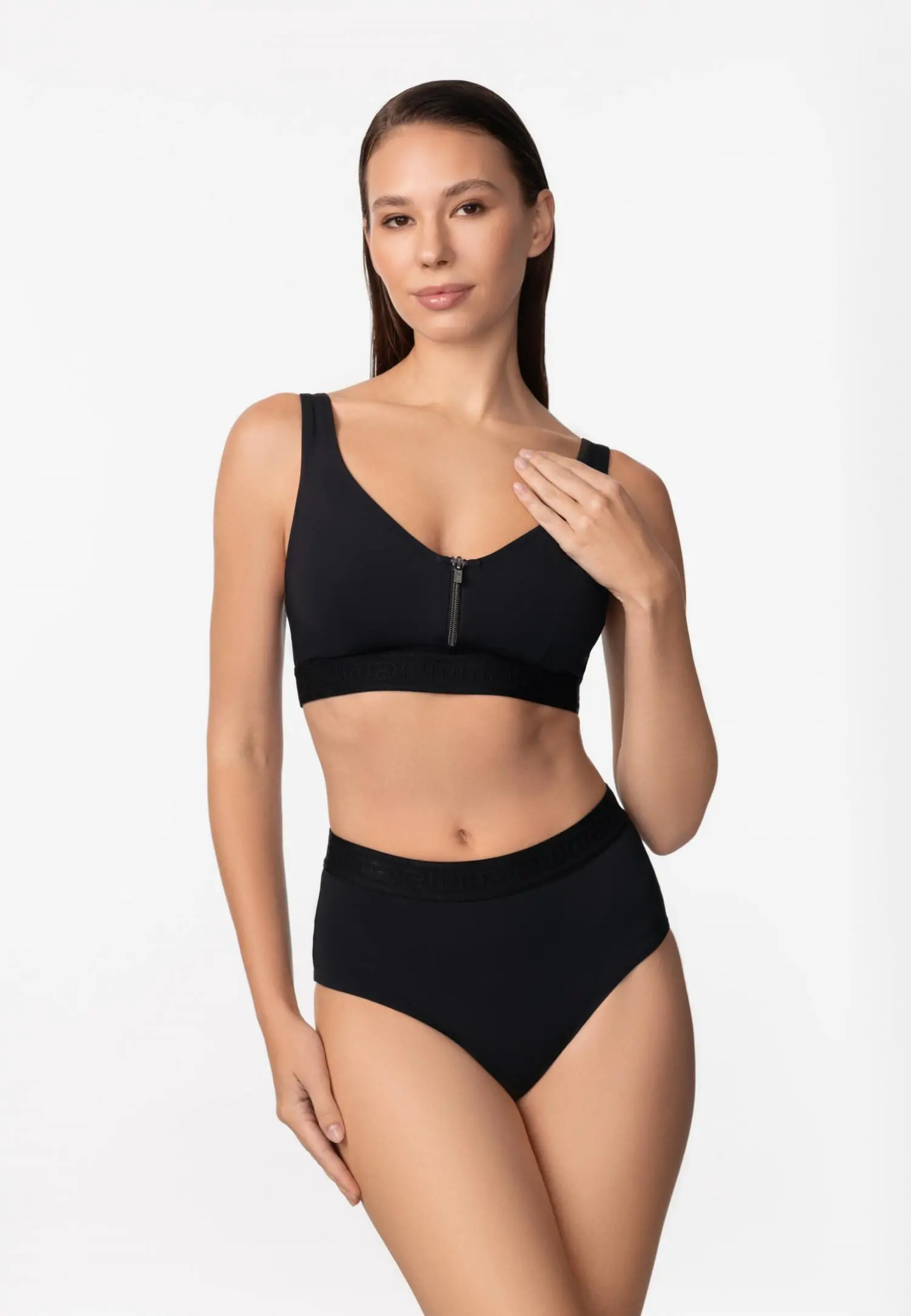 Купальник с мягкой чашкой и эластичной лентой под грудью обеспечивает комфортную посадку и поддержку. По центру передней детали — функциональная молния, придающая образу спортивную динамику. Широкие бретели из эластичной тесьмы с фирменным логотипом Marc & André подчеркивают современный характер модели.