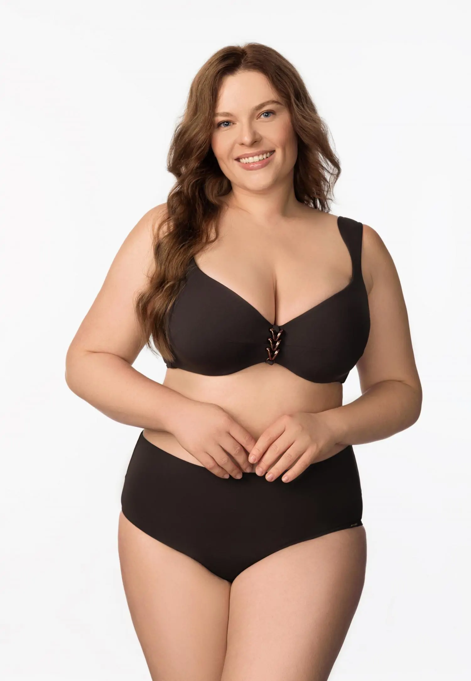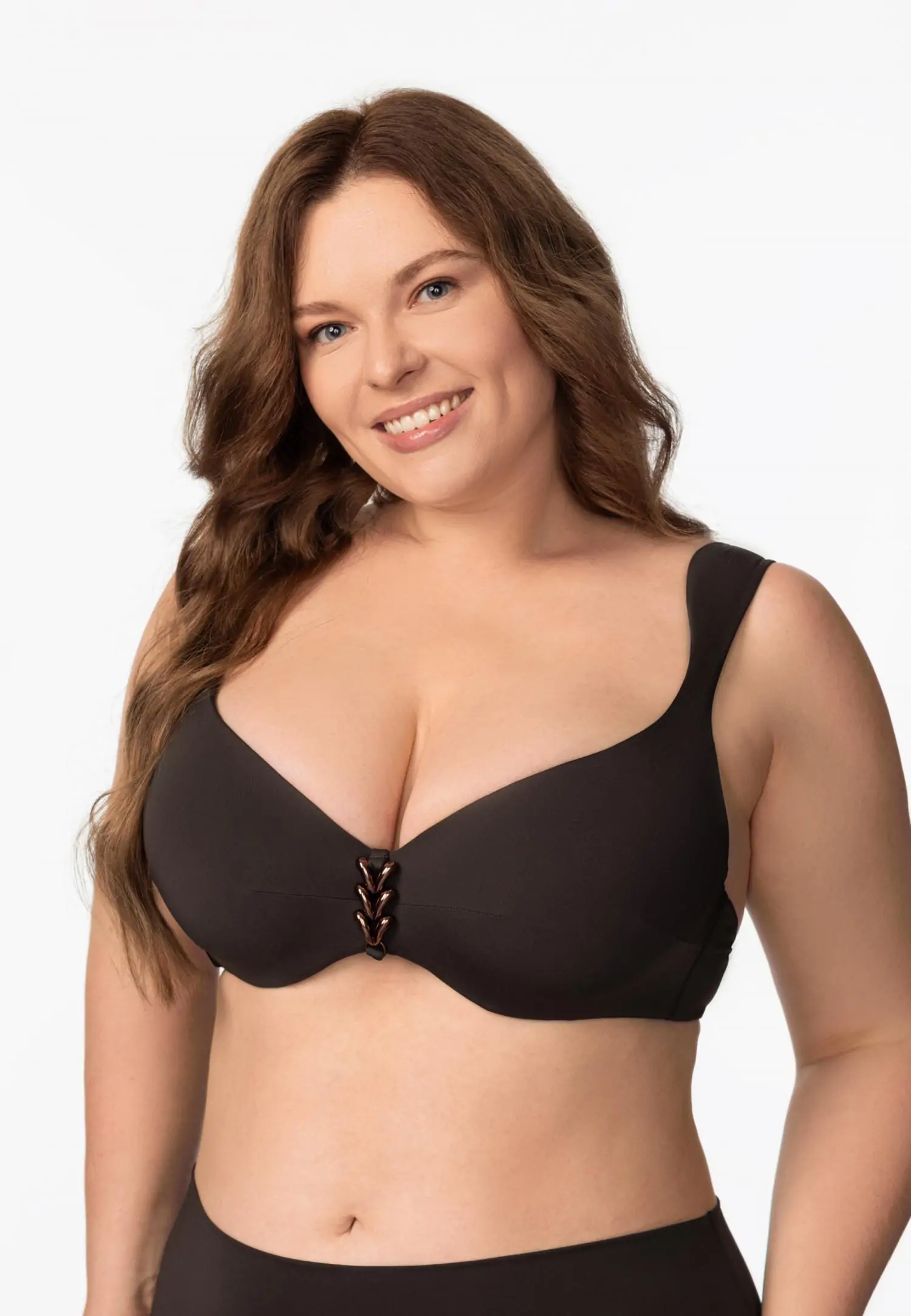 Мягкая чашка на косточках с регулируемой высотой бока чашки. Между чашек декоративная перемычка и аксессуар. Регулируемые бретели. На спине застежка.