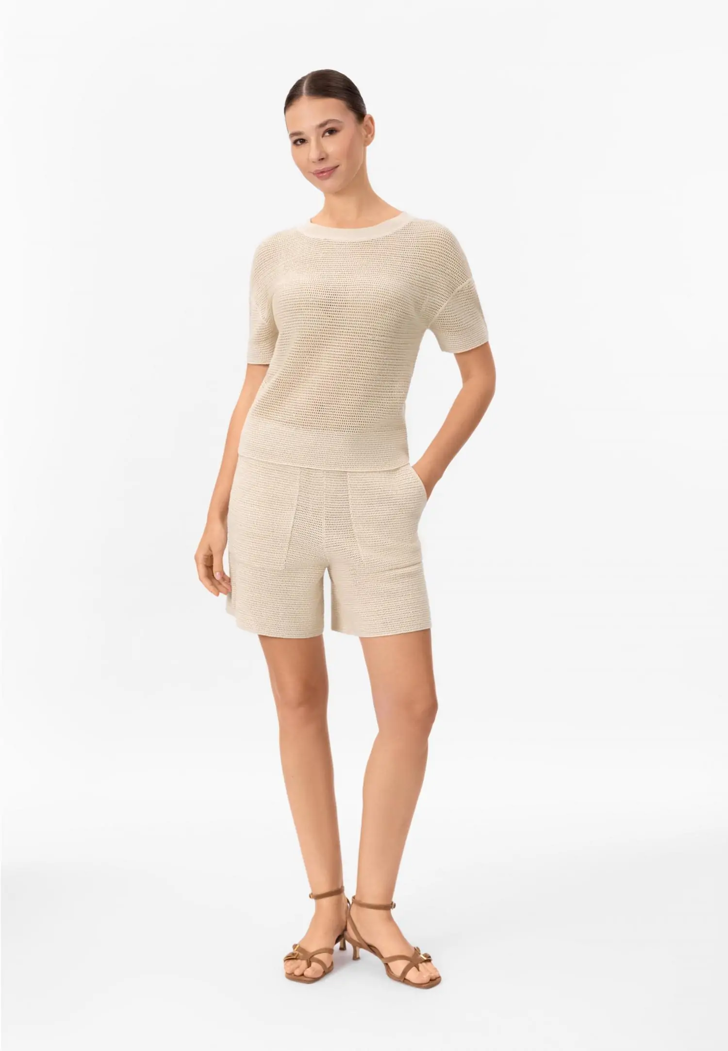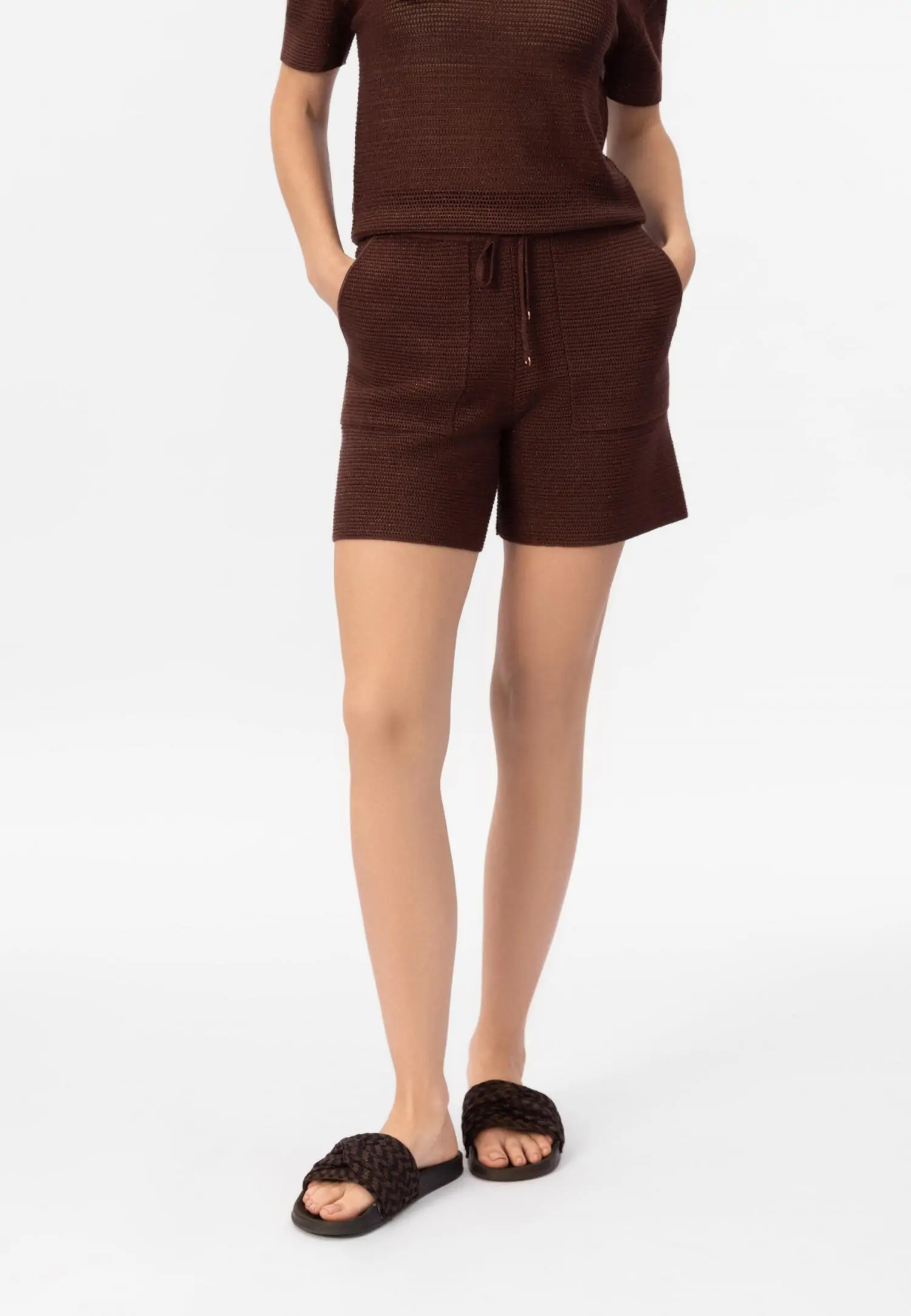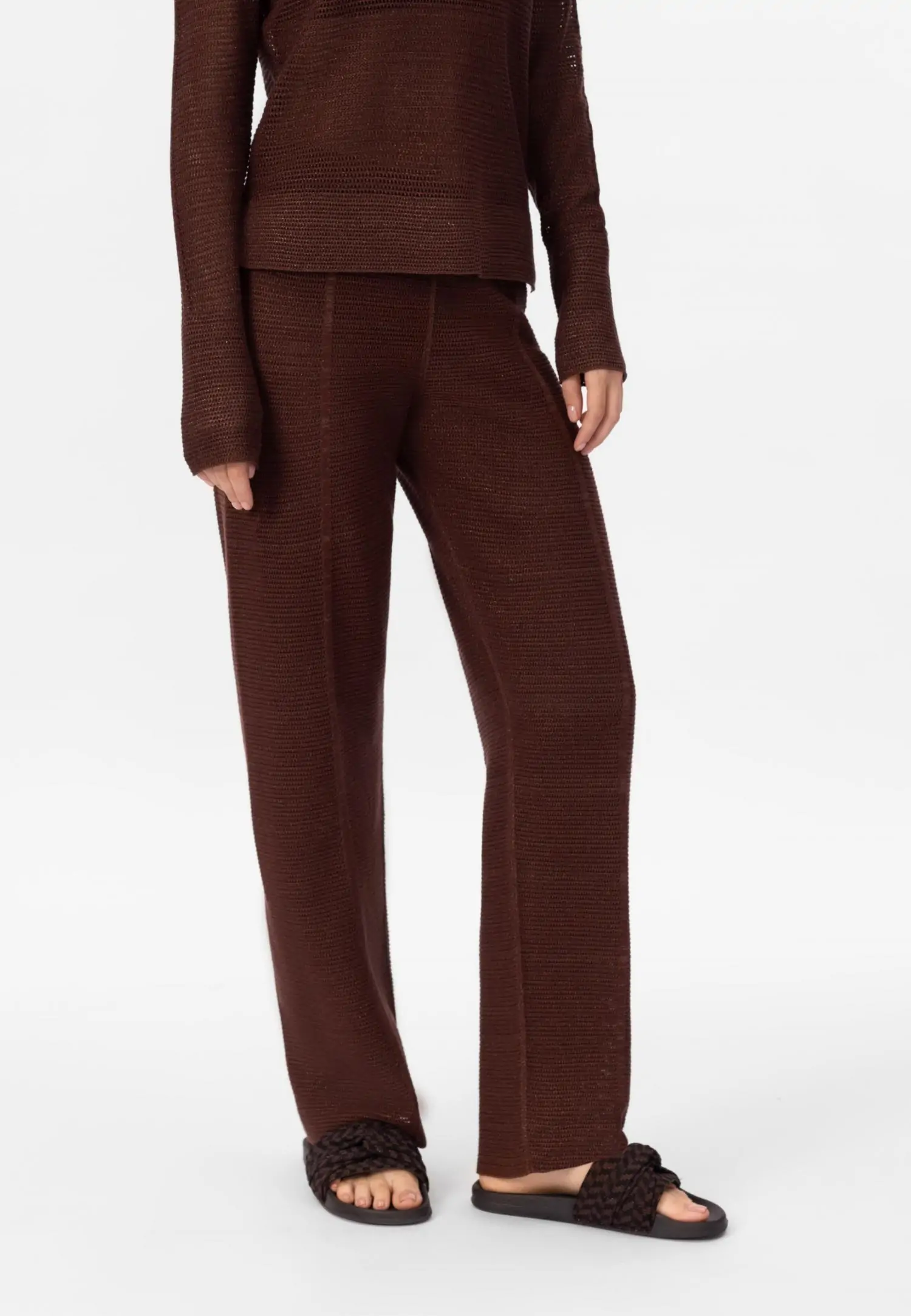 Брюки слегка зауженные книзу с оригинальной трехмерной вязкой «пчелиные соты» не только выглядят стильно, но и подчеркивают фигуру. Пояс на резинке со шнуром позволяет регулировать размер брюк. Боковы...