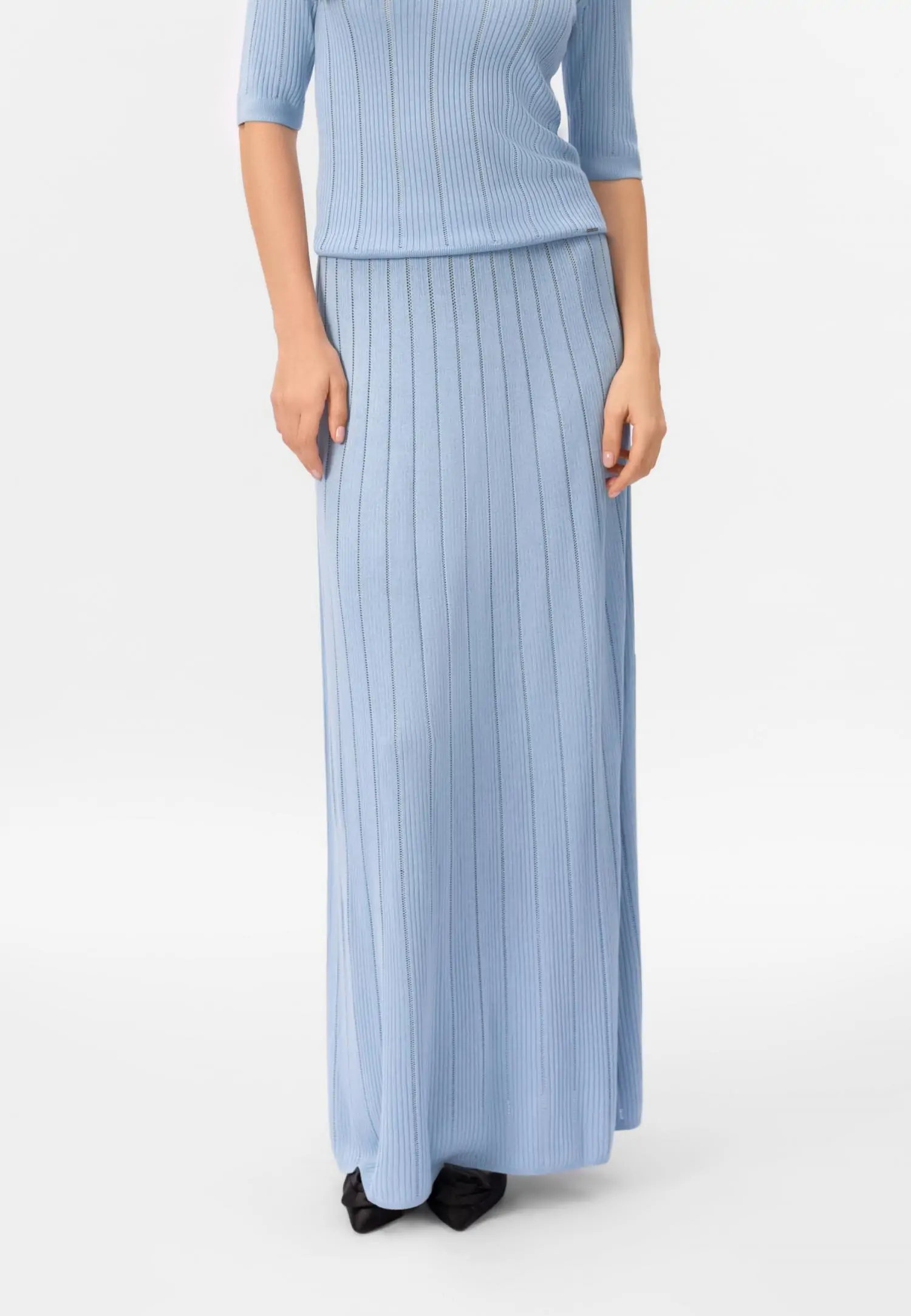 COSMIC WHISPER — элегантность без усилий. Легкие поло, кардиганы и макси-юбки из уникального трикотажа в рубчик с «пуантель» мягко обнимают фигуру, добавляя текстуры и изысканности. Смесовый шелк прид...