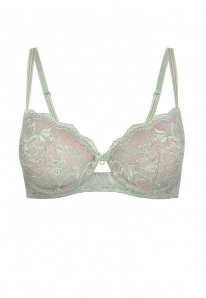 Бюстгальтер со съемными подушечками пуш-ап на косточках. Внутренняя часть чашки дублирована хлопком. Перекрест деталей из микрофибры и кружева на боковой панели скрывает проблемные зоны в области. Круглая комфортная спинка. Широкий размерный ряд.