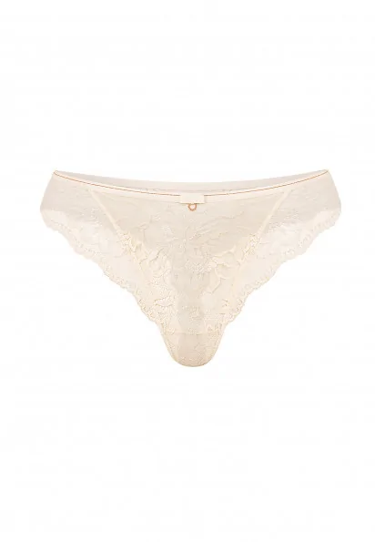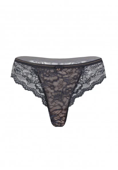 Кружевные стринги со средней посадкой. Декоративный пояс из эластичной тесьмы с золотистой нитью добавляет блеска. Передняя и задняя деталь из кружева с ажурными краями.