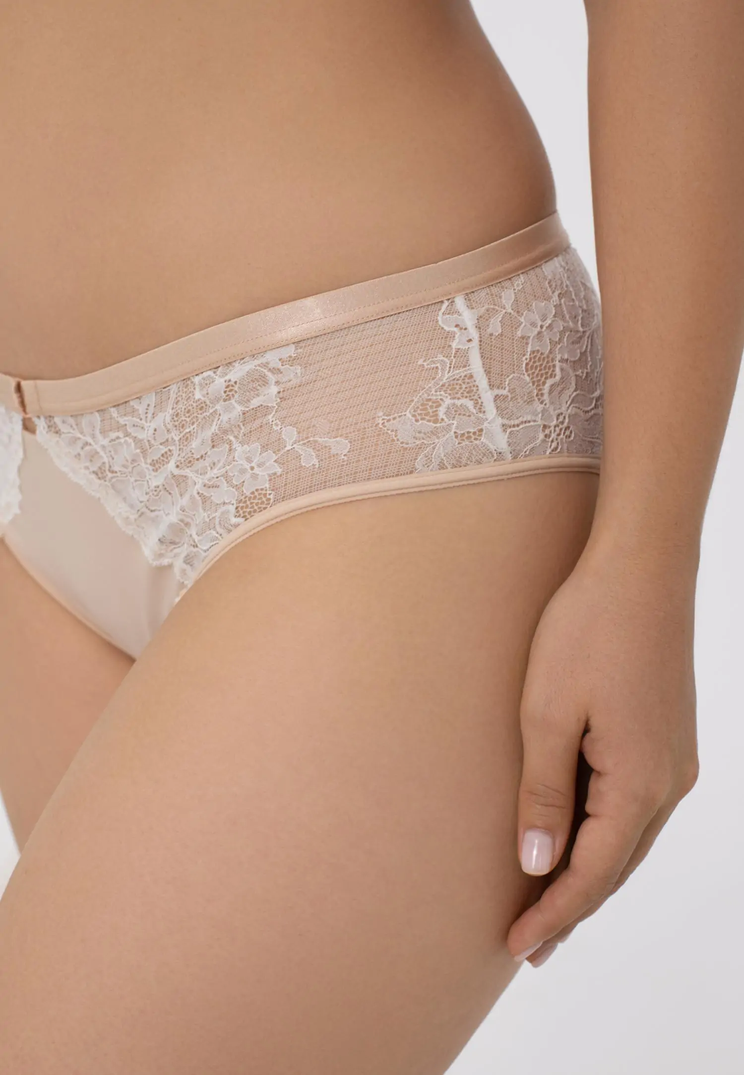 Кружевные трусы-бразилиана со средней линией талии. Передняя деталь из кружева, подкладка из сетки. На задней детали кружевные вставки с ажурными краями.
