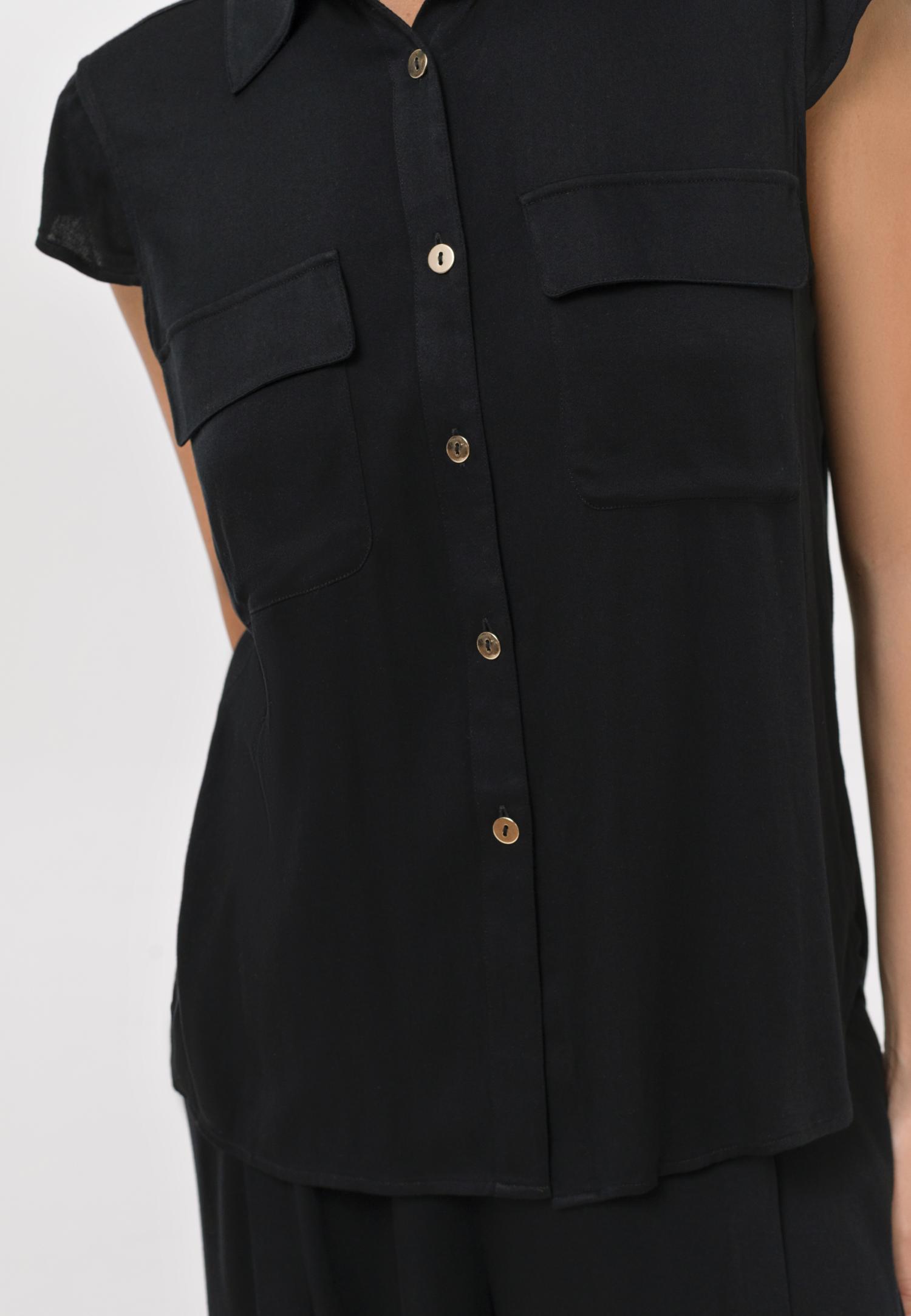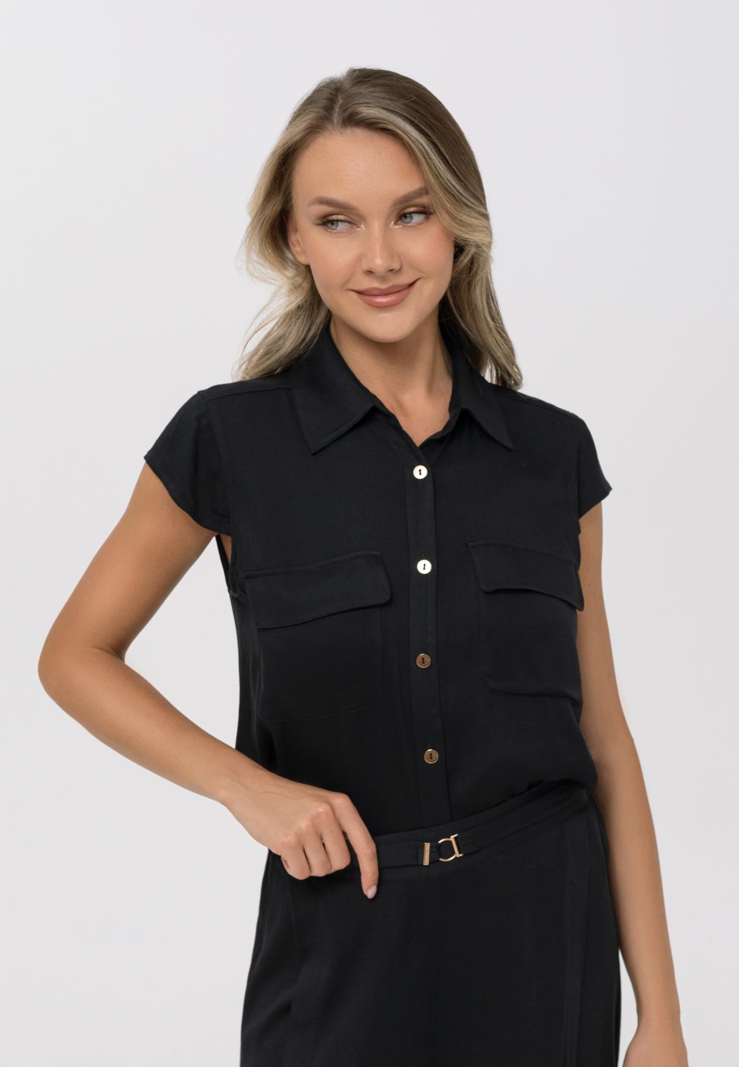 Летняя блуза на пуговицах с короткими рукавами-крылышками из вискозы. Спереди накладные карманы.