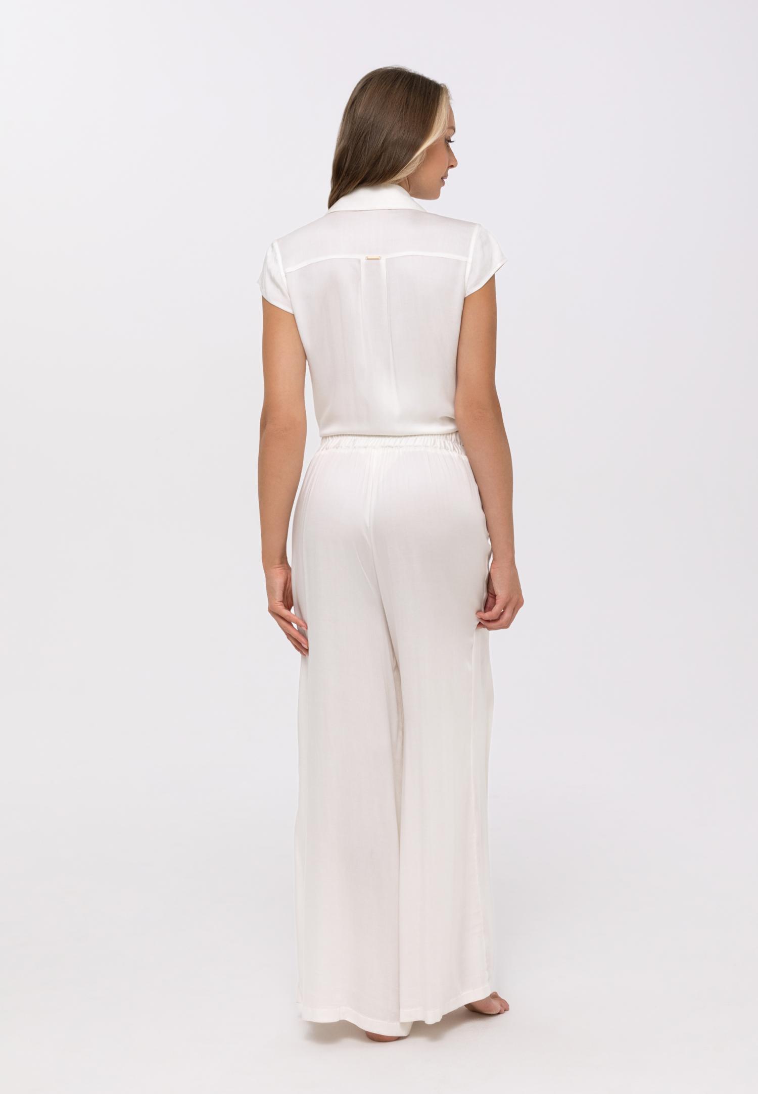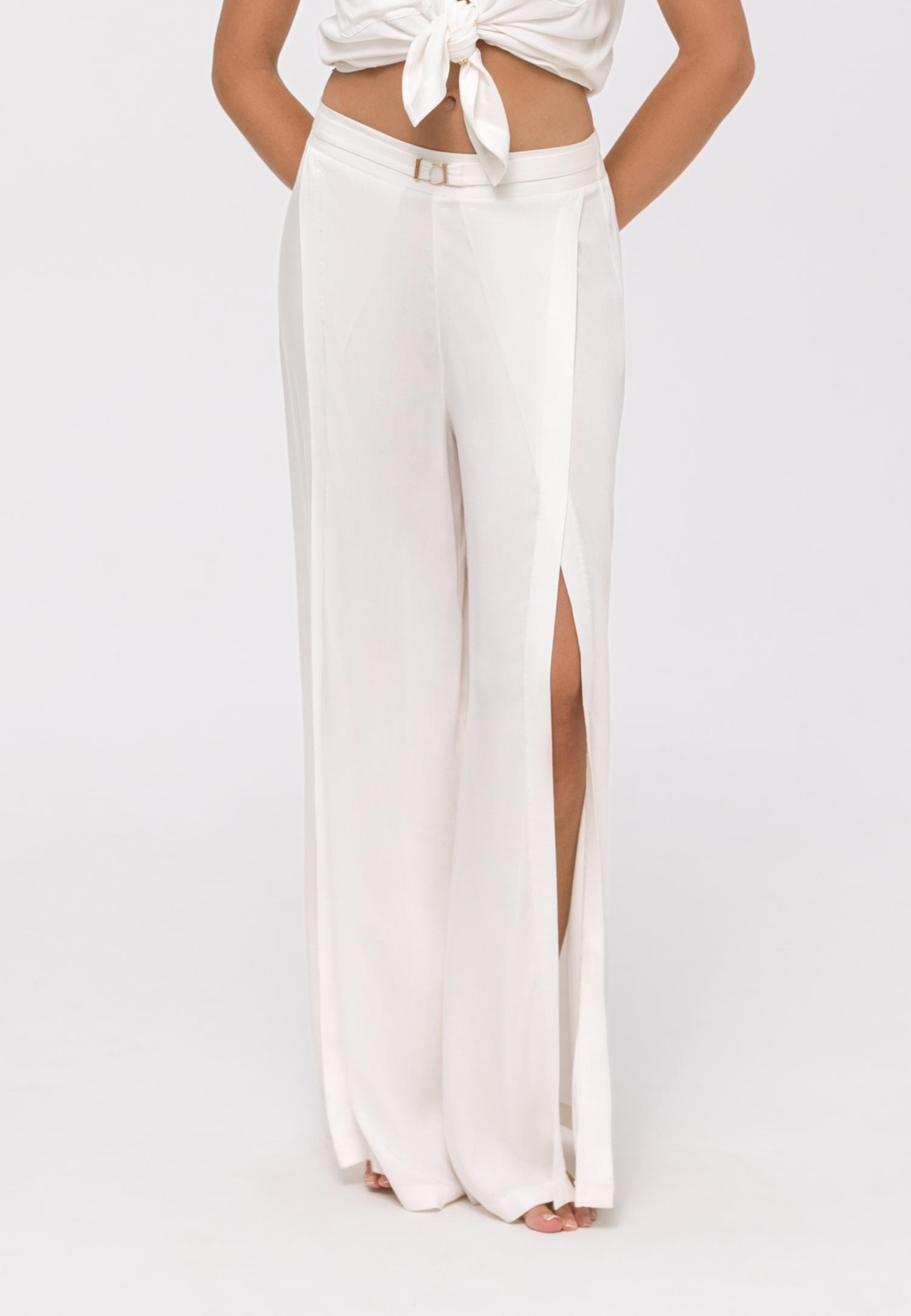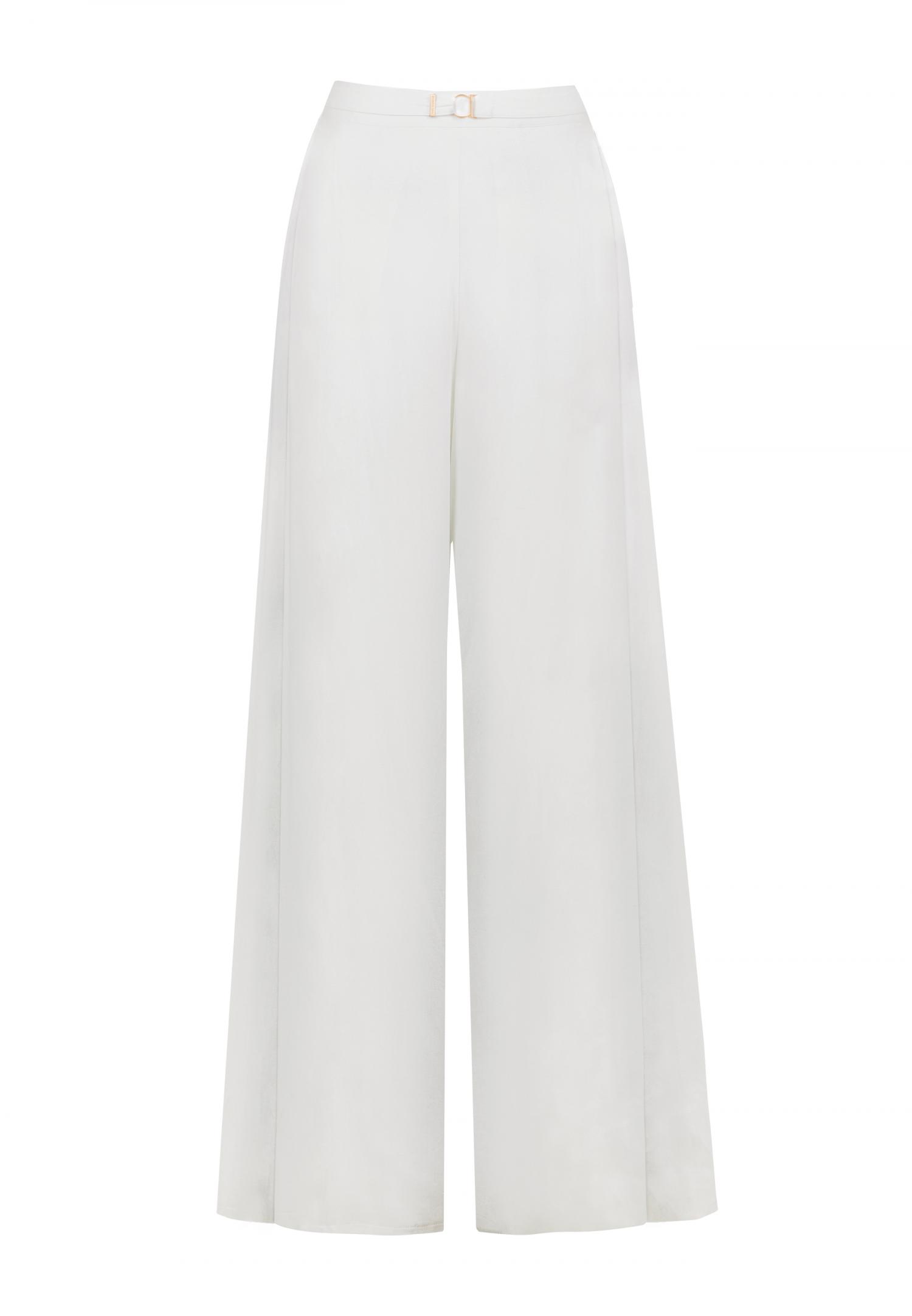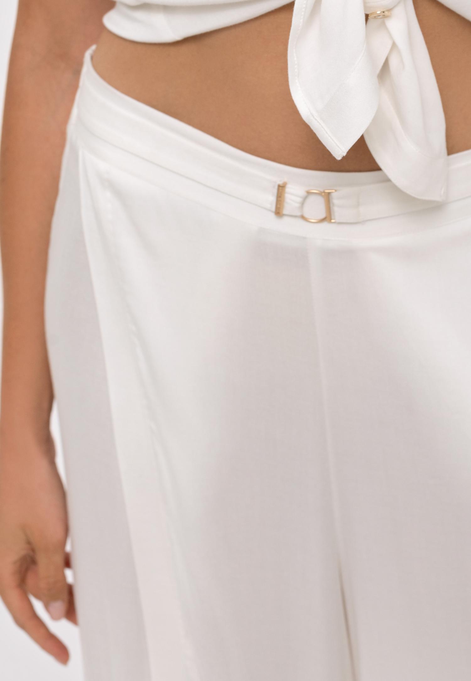 Летние широкие брюки с высокой посадкой с эффектом запахаиз вискозы. Пояс с декоративным аксессуаром на передней детали и эластичной резинкой на задней детали.