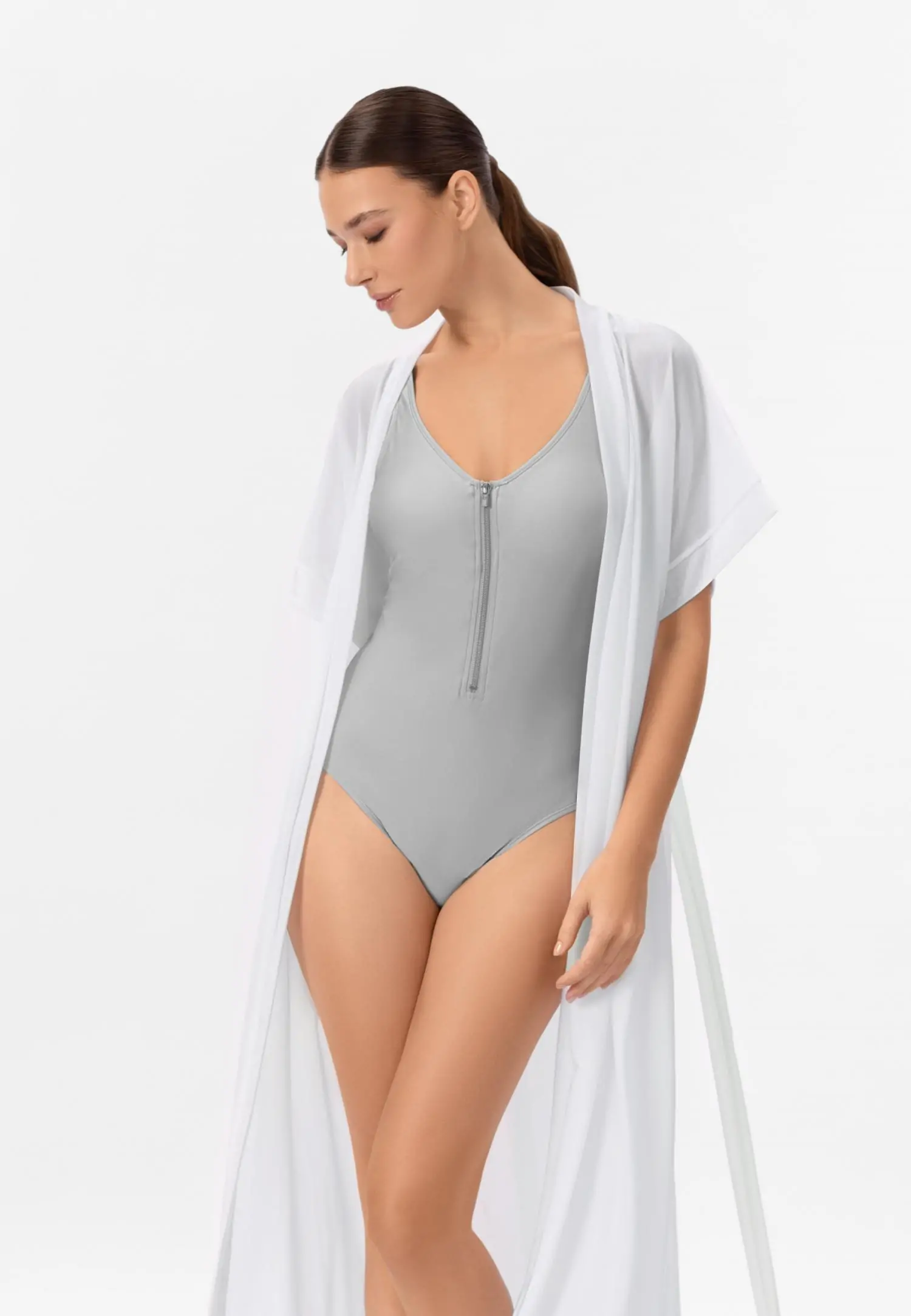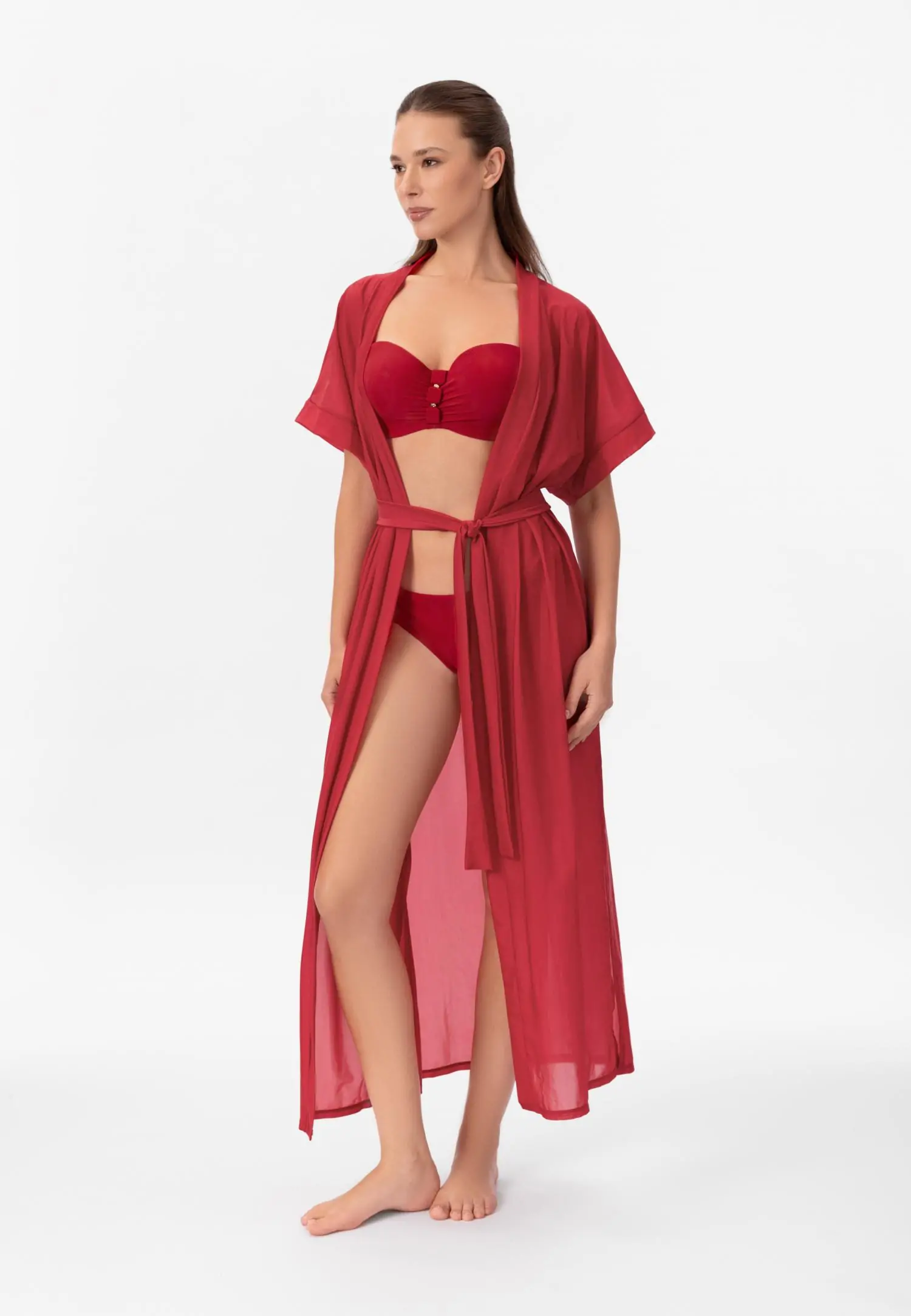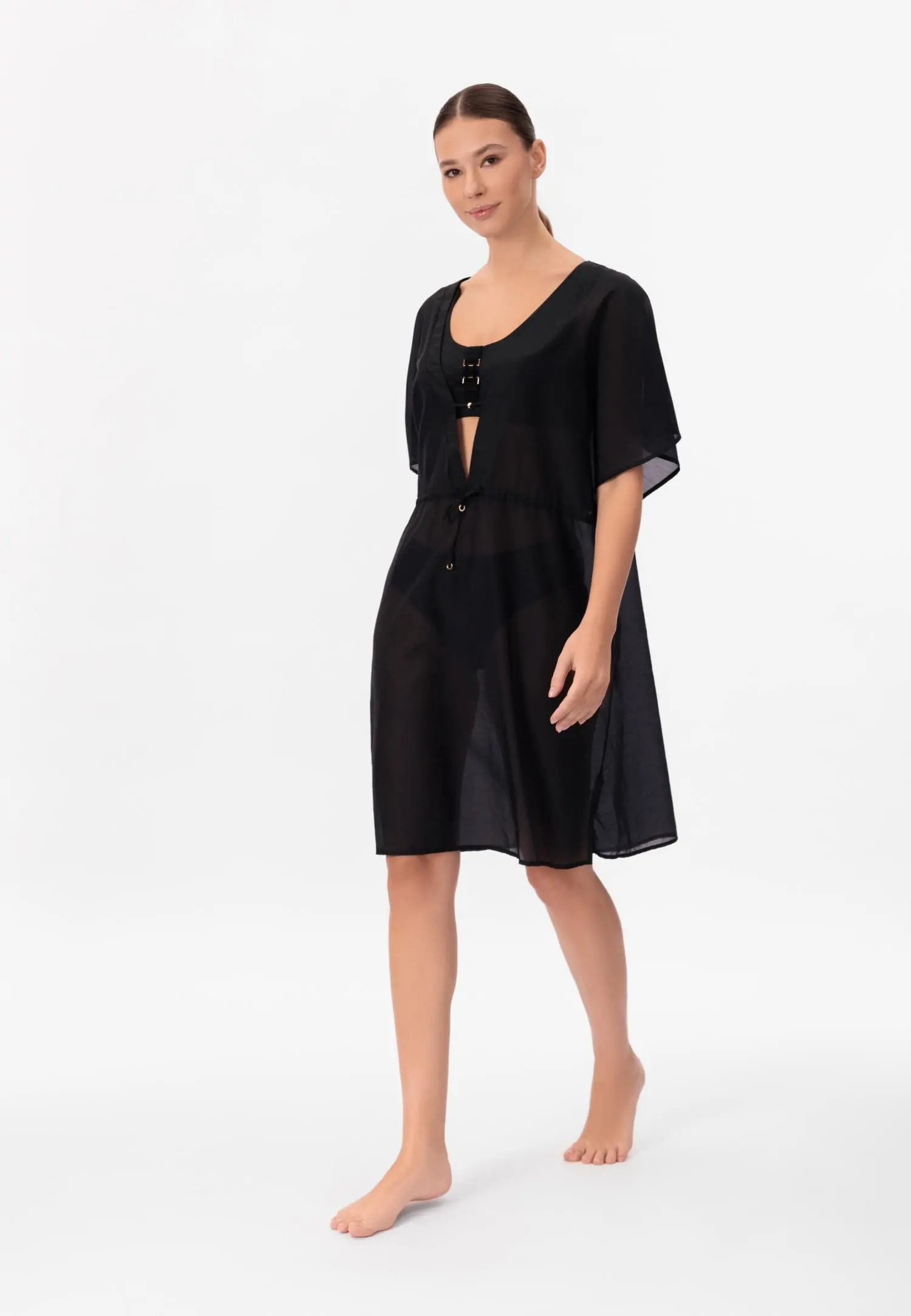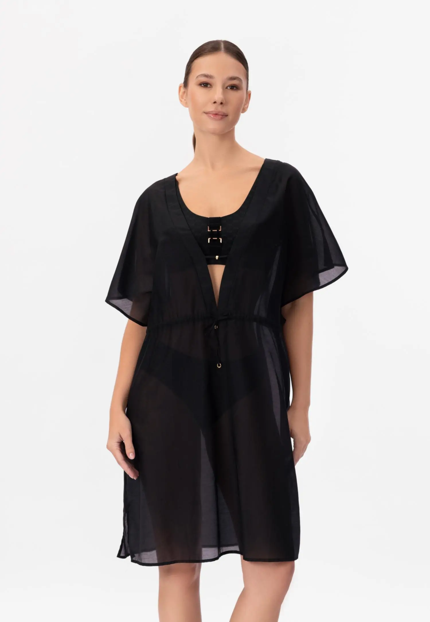 Туника свободного кроя с эффектом омбре, длина до уровня колен. V-образный вырез горловины. Рукава напоминают крылья бабочки. Съемный пояс. «Placement» принт.