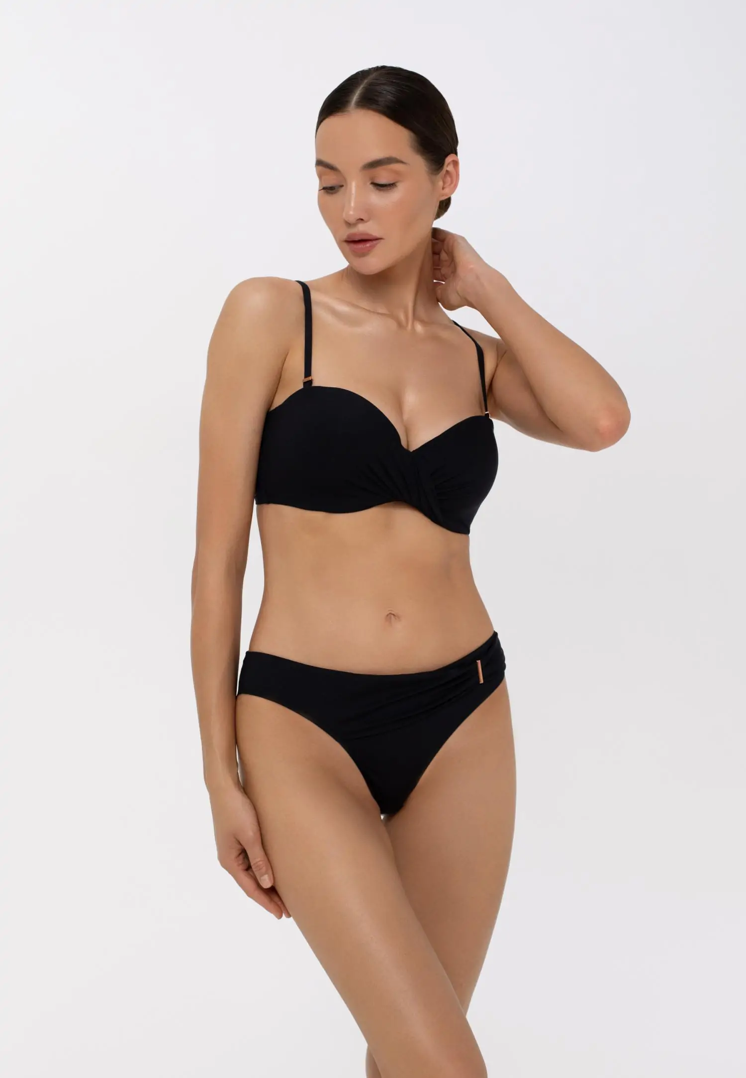 Tugikaartega balconette stiilis bikiinitopp. Eemaldatavad ja reguleeritava pikkusega õlapaelad. Seljaosal niklivabast metallist kinnitus.
