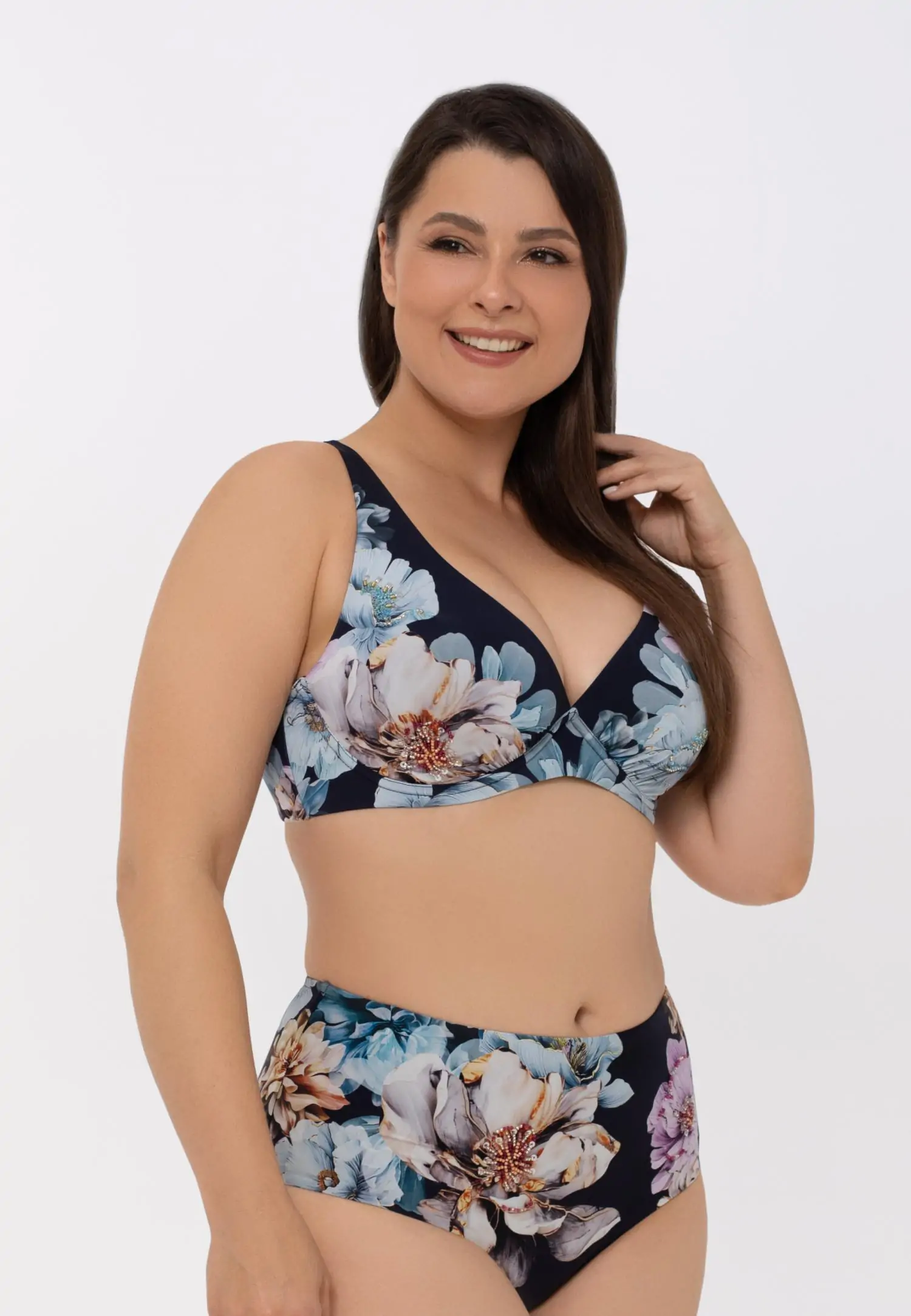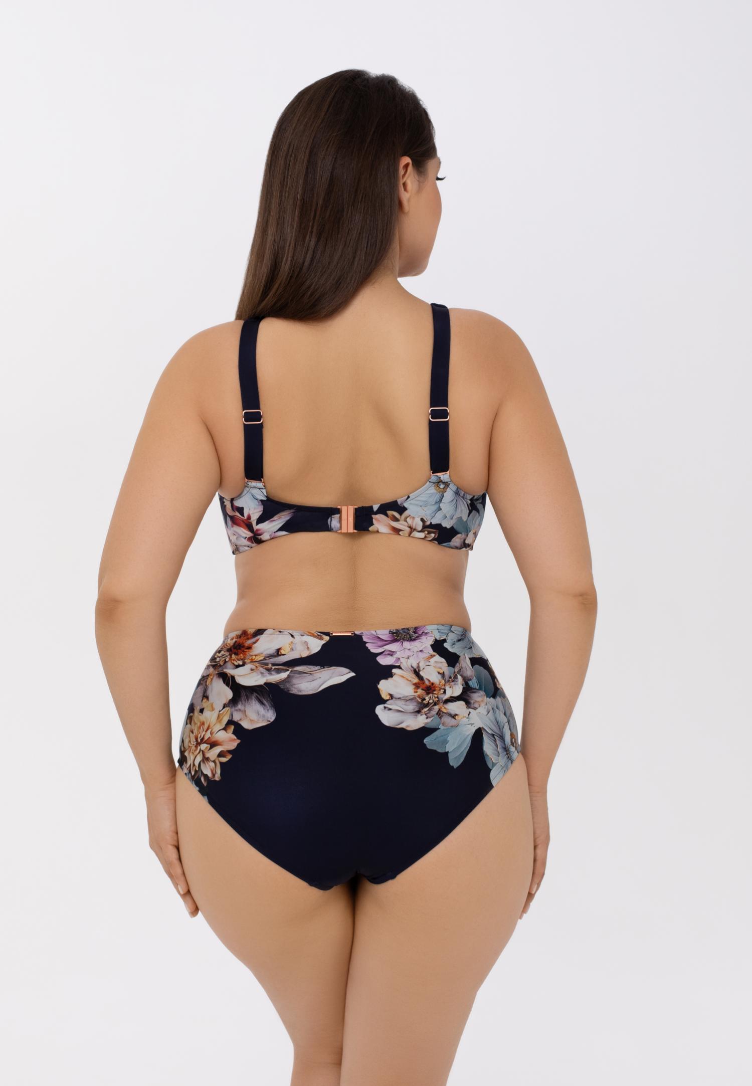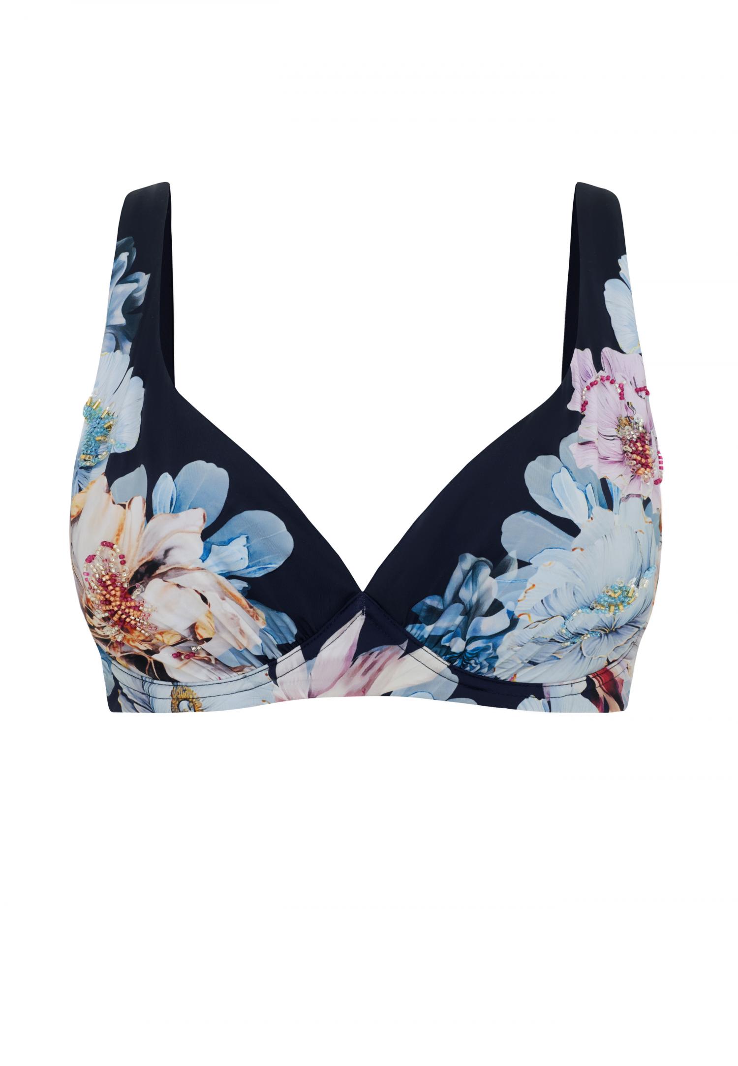 Tugikaartega ja täielikult pehme korviga bikiinitopp, millel ei ole sees polsterdust. Hingav ja kiiresti kuivav avara V-lõikelise dekolteega mudel. Reguleeritavad laiemad õlapaelad. Seljaosal niklivabast metallist kinnitus. Toote loomisel on korvidel kasutatud fikseeritud mustri paigutust, rõhutades disaini eripära ja terviklikkust.