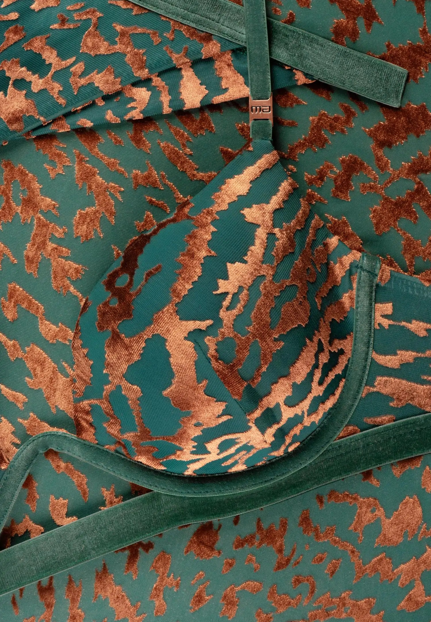 NATURE’S MELODY kollektsioon ühendab endas loodusest inspireeritud disaini ja jätkusuutlikkuse. Ümbertöödeldud polüestrist valmistatud pehme sametkangas loob luksusliku tekstuuri, tumeroheline ja vasekarva toonid toovad esile sügavuse ja elegantsuse. Valguse käes mänglevad sametdetailid meenutavad troopilisi koralle ja loodusmustreid. Minimalistlikku siluetti täiendavad sametist elastikpaelad, metalsed detailid ja V-lõikelised aktsendid, mis aitavad kaunilt siluetti rõhutada. See kollektsioon on loodud neile, kes hindavad kvaliteeti, isikupära ja keskkonnasõbralikku luksust.