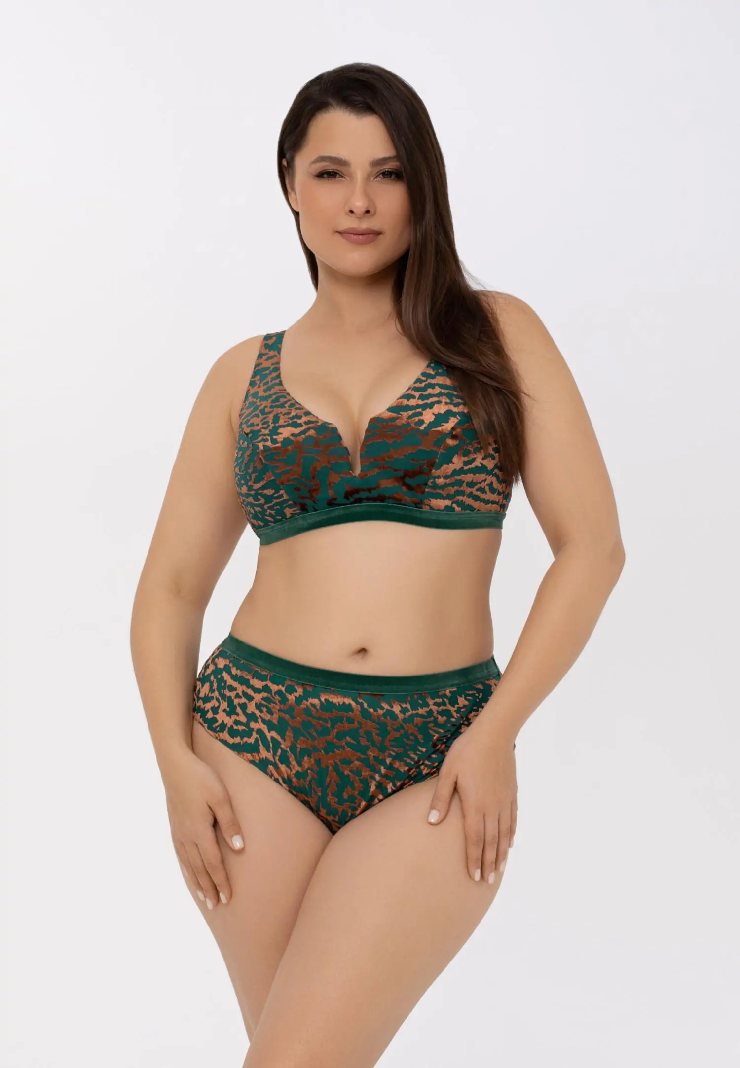 NATURE’S MELODY kollektsioon ühendab endas loodusest inspireeritud disaini ja jätkusuutlikkuse. Ümbertöödeldud polüestrist valmistatud pehme sametkangas loob luksusliku tekstuuri, tumeroheline ja vasekarva toonid toovad esile sügavuse ja elegantsuse. Valguse käes mänglevad sametdetailid meenutavad troopilisi koralle ja loodusmustreid. Minimalistlikku siluetti täiendavad sametist elastikpaelad, metalsed detailid ja V-lõikelised aktsendid, mis aitavad kaunilt siluetti rõhutada. See kollektsioon on loodud neile, kes hindavad kvaliteeti, isikupära ja keskkonnasõbralikku luksust.