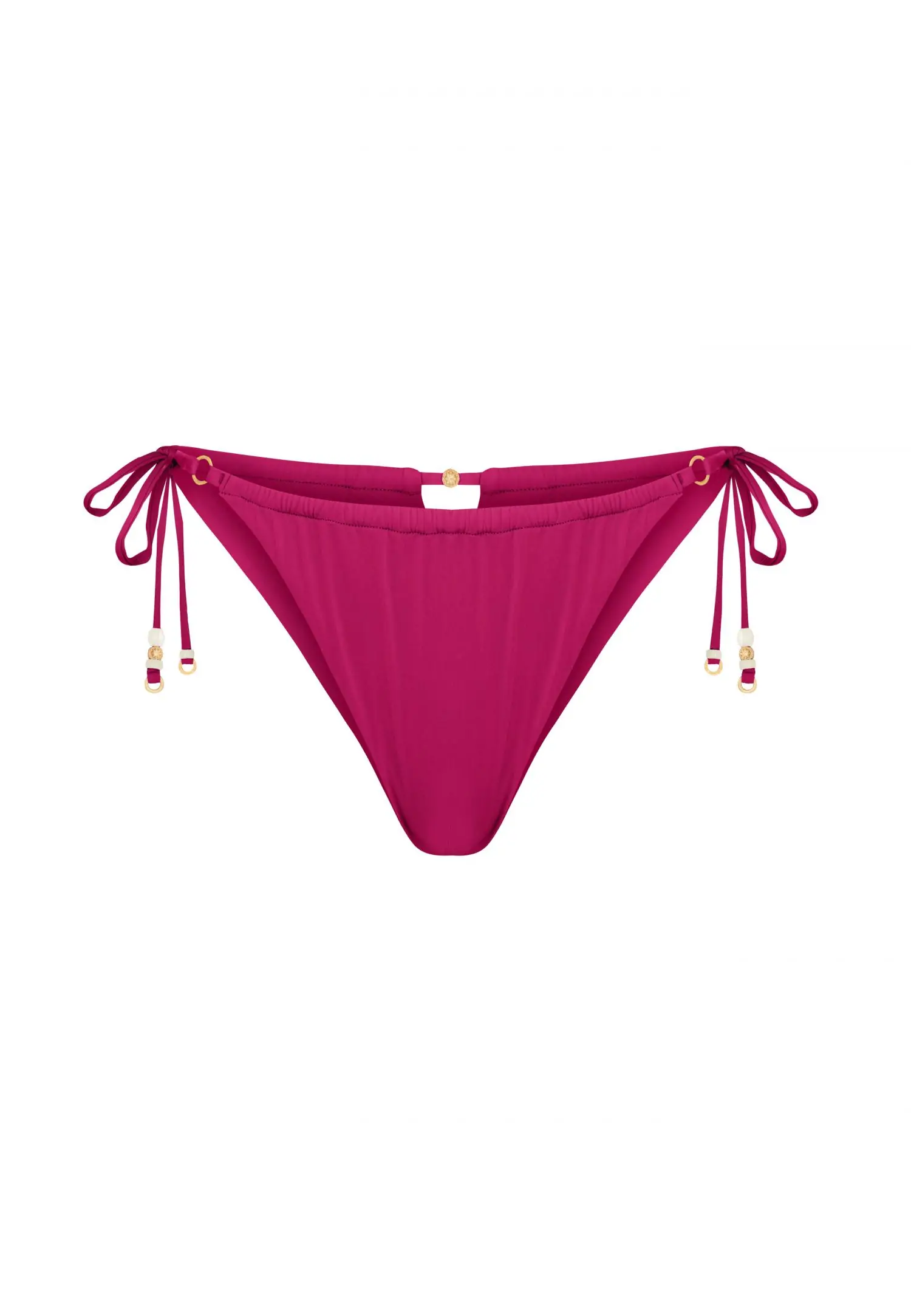 Madalalõikelised ja napi tagaosa katvusega brazilian-stiilis bikiinipüksid. Vööjoon on kaarja joonega ning drapeeritud kroogetega. Külgedel on seotavad paelad.