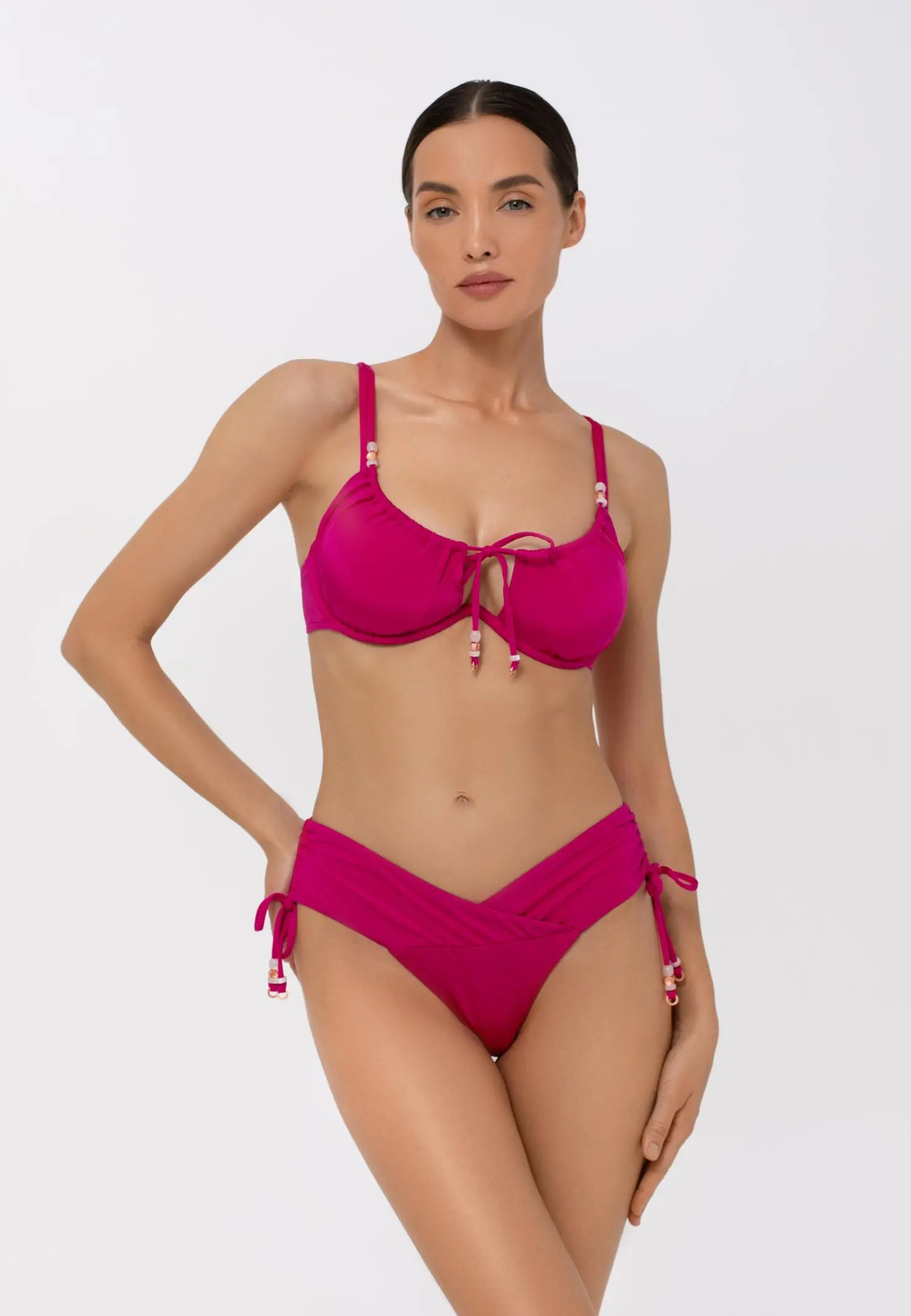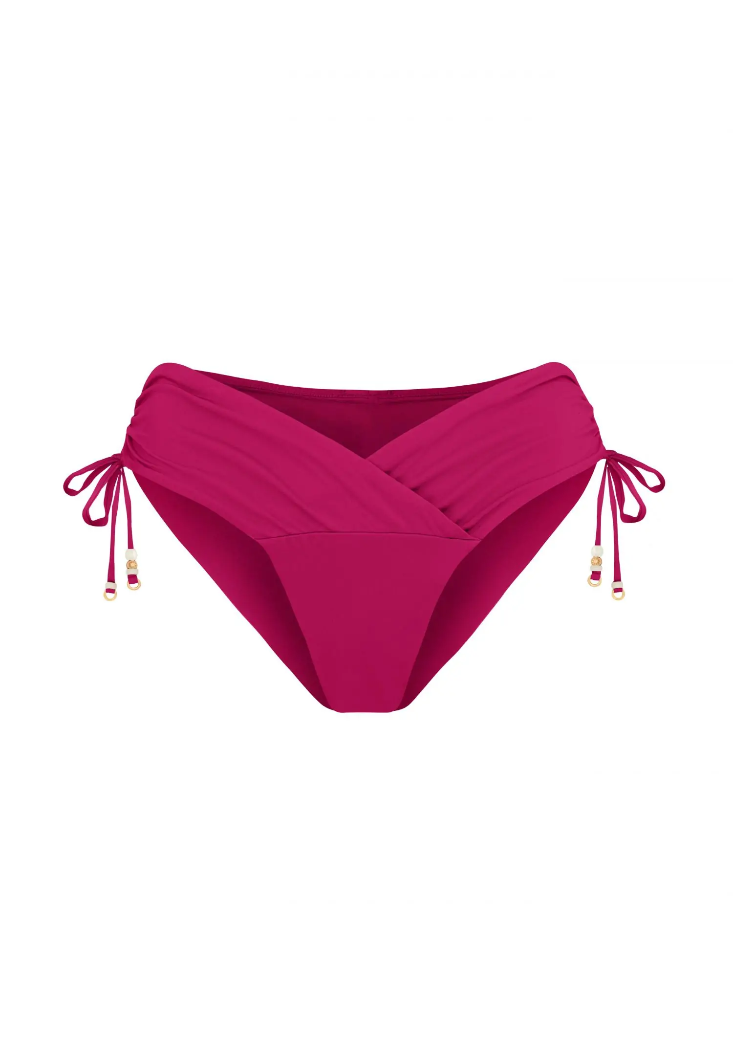 Madalalõikelised ja napi tagaosa katvusega brazilian-stiilis bikiinipüksid. Vööjoon on kaarja joonega ning drapeeritud kroogetega. Vooder esiküljel pakub lisamugavust ja katvust. Külgedel on seotavad paelad.